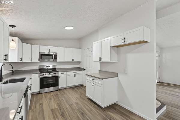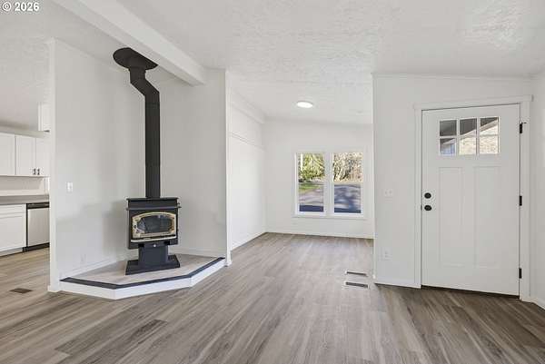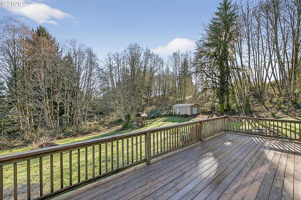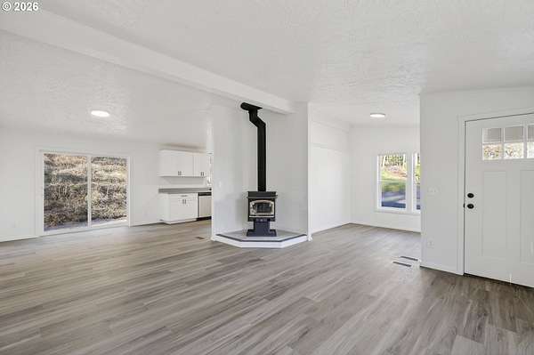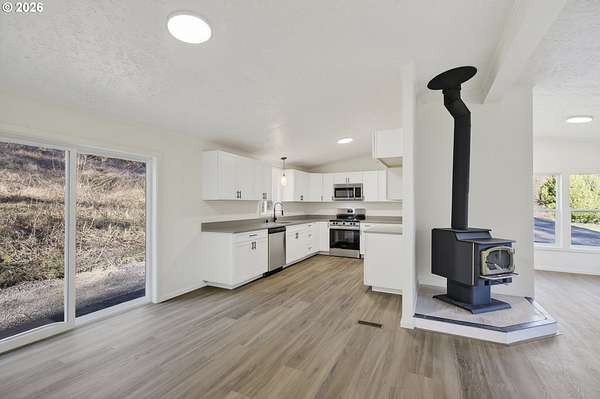 Tucked away in a quiet rural setting just outside of town, this fully renovated 3-bedroom, 2-bath home offers privacy, space, and a fresh start on over 2.5 acres. The interior has been completely refreshed and feels clean, bright, and welcoming, featuring new vinyl windows, sleek laminate flooring, and fresh carpet throughout. The open living area is centered around a cozy wood stove and flows easily for everyday living.The kitchen has been thoughtfully updated with quartz countertops, soft-close shaker cabinets, and stainless steel appliances, combining modern style with functionality. The layout is simple and comfortable, offering well-designed living spaces throughout the home. Major updates include a new roof, a brand-new septic system, and a newly built deck, providing peace of mind and added outdoor living space. Outside, the property features a medium-sized shop and an additional work shed, along with open land and wooded surroundings that create a peaceful, private setting. A rare opportunity to own a truly move-in-ready home on private acreage-seize it while it lasts.