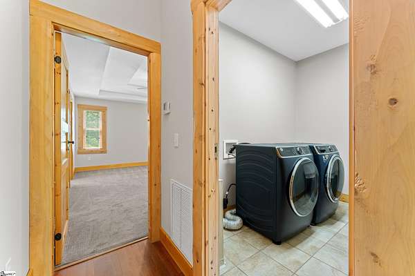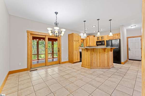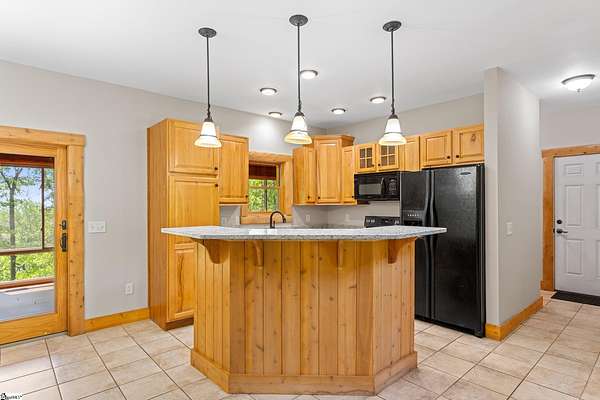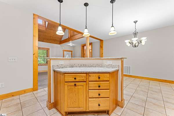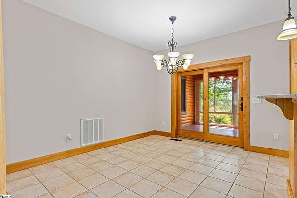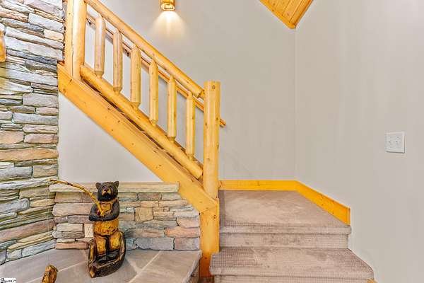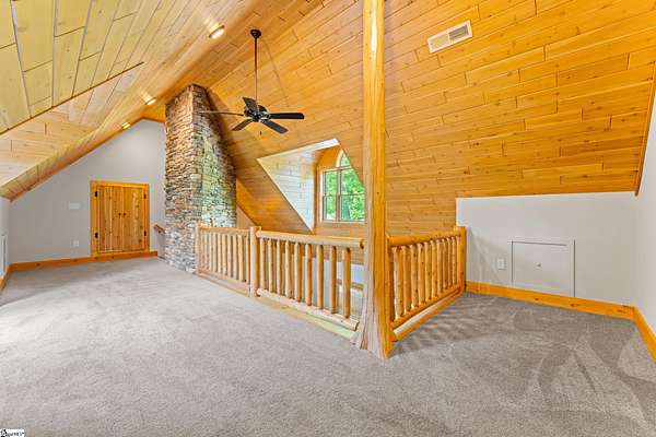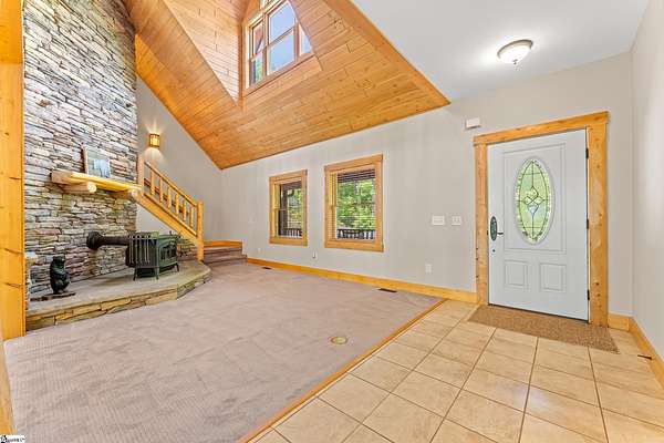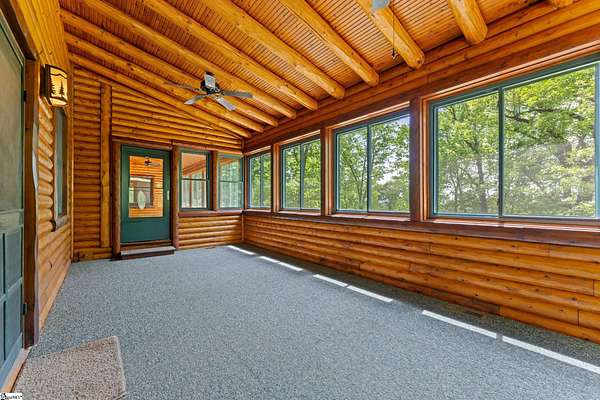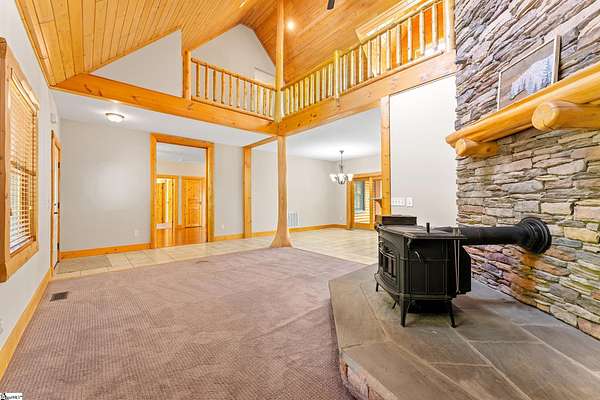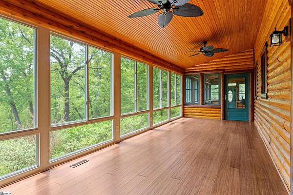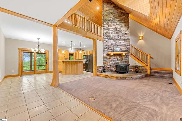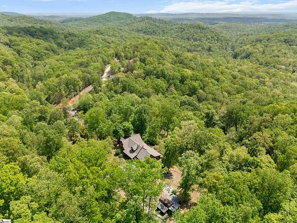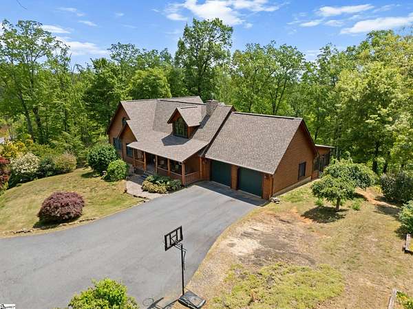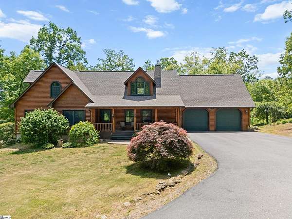 Escape to your own private sanctuary—where serenity, seclusion, and natural beauty converge on 8.5 breathtaking acres. Tucked away along a private drive and nestled mountainside among mature trees and abundant wildlife, this exceptional log cabin-style retreat offers the feeling of a peaceful escape while delivering the comfort of modern living. A welcoming rocking chair front porch sets the tone, inviting you to slow down and take in the surroundings. Inside, the open concept floor plan is flooded with natural light, highlighted by a dramatic two-story great room featuring a stunning stacked stone chimney and woodstove—creating a warm, inviting centerpiece. The space flows seamlessly into the dining area and well-appointed kitchen, complete with granite countertops, a full appliance package, and a center island perfect for casual meals. Just off the kitchen, you’ll find a convenient half bath for guests and direct access to the attached two-car garage. One of the home’s most captivating features is the series of four-season porches that truly make you feel as though you’re living in a treehouse—offering panoramic views of the mountains, native trees, and ever-changing landscape. A versatile flex room off the main living area provides endless possibilities as a secondary living space, home office, or formal dining room. The main level also includes a guest bedroom and full bath, along with a walk-in laundry room for everyday ease. The primary suite serves as a tranquil retreat, featuring a double trey ceiling, spacious walk-in closet, and a spa-inspired bath with dual sinks, a jetted tub, and a separate shower. Upstairs, a loft opens to sweeping views from every window and offers the perfect reading nook tucked beneath the natural light. A large storage area off the loft doubles as a dream space for a playroom or imaginative hideaway. Two additional bedrooms—one with a walk-in closet—share a full bath, providing ample room for family or guests. Throughout the home, thoughtful details shine, including recessed lighting, wide moldings, and beautifully carved columns that elevate the rustic elegance. Outdoors, the possibilities are endless—from gathering around the built-in firepit under the stars to enjoying the detached building with electricity, ideal for a workshop, hobby space, or additional storage with covered areas on either side. Recent updates—including the roof, HVAC, well pump, and tanks—offer peace of mind, while the paved drive and ample parking ensure convenience for you and your guests. While you’ll feel blissfully secluded, this private retreat is ideally located just minutes from the Saluda River, Poinsett Bridge, Eagle Mountain Winery, Chestnut Ridge Hunting Preserve, and a variety of the Upstate’s most beloved hiking and biking trails. Greenville is just 35 minutes away, downtown Travelers Rest 15 minutes, and both Spartanburg and Asheville are within an hour’s drive. A rare offering where lifestyle, layout, and location come together—this is more than a home; it’s an experience.