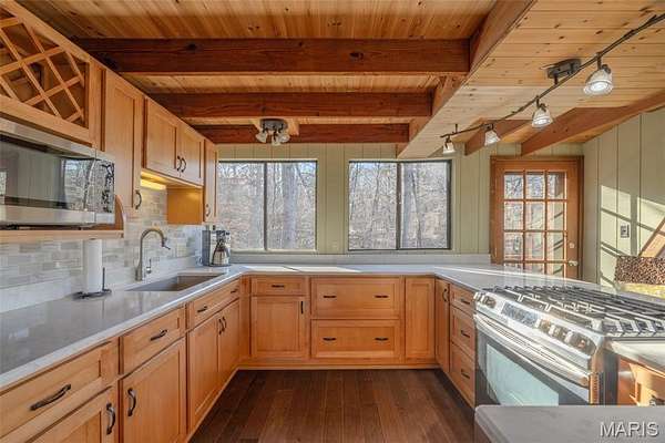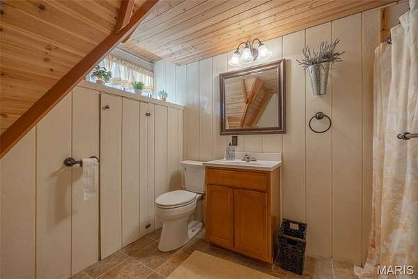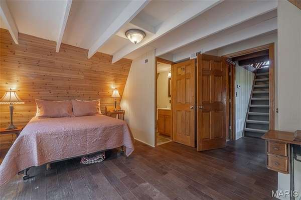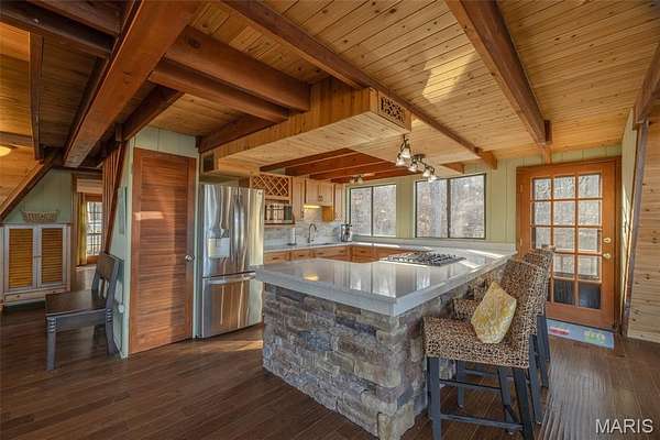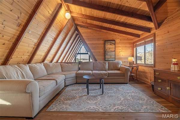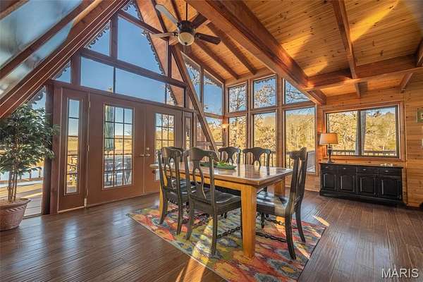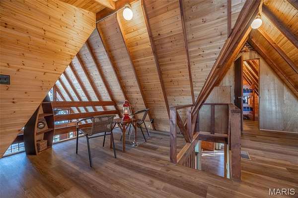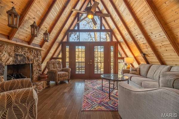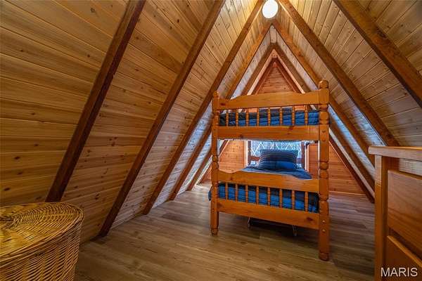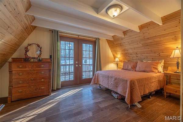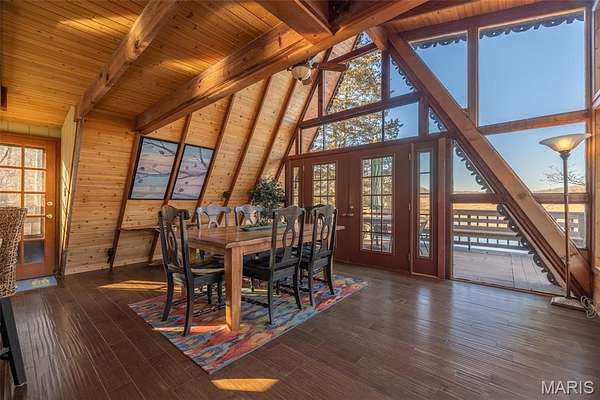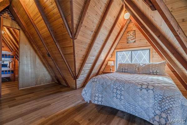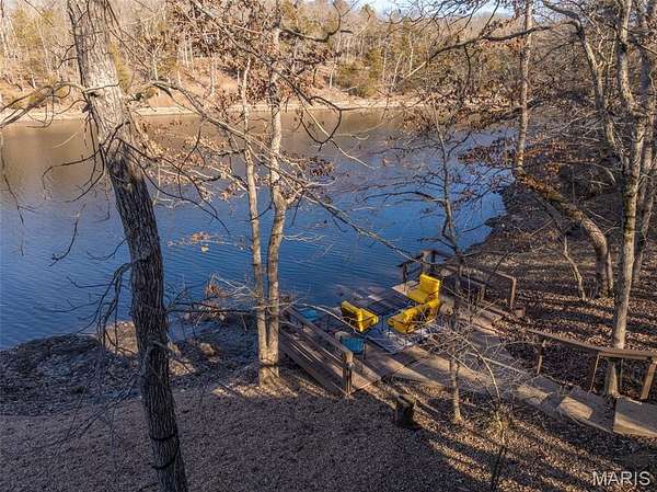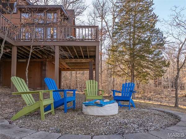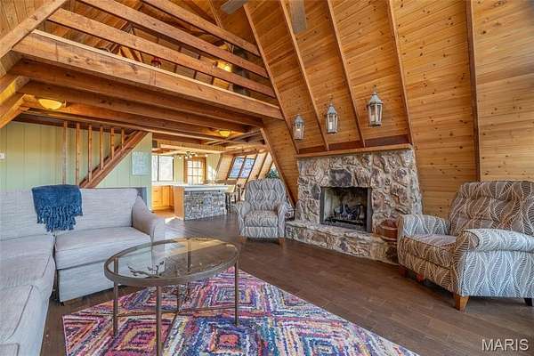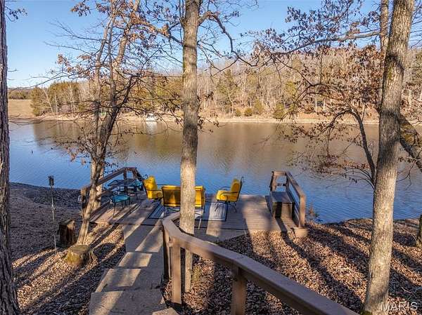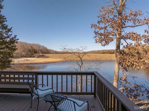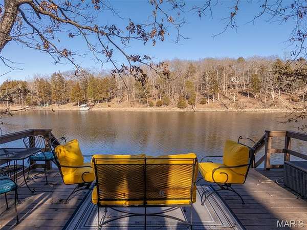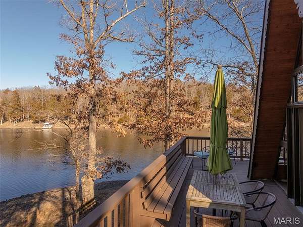 Welcome to 152 Innsbrook Grove Drive, a phenomenal lakefront retreat in the heart of Innsbrook Resort. Perfectly positioned along the shoreline of 50-acre Innsbrook Lake, this inviting chalet offers the peaceful waterfront lifestyle buyers are searching for. With 315' of water frontage and a new dock you can fully enjoy sailing, kayaking, paddleboarding, fishing, or cruising in an electric pontoon boat. The nearby community beach adds even more opportunities for fun-filled days at the lake. A lakeside firepit, concrete walkways, and a massive wraparound deck create an ideal setting for entertaining or simply taking in the sunrise with a quiet cup of coffee. Inside, the home is warm and welcoming. Tongue-and-groove cedar ceilings and hardwood floors run throughout, giving it that classic Innsbrook charm. The recently remodeled oversized kitchen serves as the centerpiece of the home, featuring beautiful cabinetry, quartz countertops, and stainless steel appliances, perfect for preparing meals. The vaulted dining area showcases a dramatic wall of windows overlooking the water, filling the space with natural light and stunning views. Just steps away, the comfortable living room with a gas fireplace offers a relaxing place to gather for movies or unwind with a good book. The main floor includes a spacious primary bedroom with its own half bath, along with a full bathroom for guests. Upstairs, a large sleeping loft doubles as an entertainment area, ideal for kids or additional visitors, plus a second bedroom complete with bunk beds. This property is being sold fully furnished and is ready for immediate enjoyment. With high-speed fiber optic internet now available throughout Innsbrook, extended stays and remote work at the lake are easy and convenient. There is ample parking for friends and family and additional storage below the home for lake equipment and outdoor gear. Enjoy added privacy and tranquility, as this chalet is designated for second-home use only and is not eligible for rental, helping preserve the peaceful setting. Please note the lake level is currently lowered due to a silt renewal project by the Innsbrook Homeowners Association on the opposite end of the lake. Water levels are expected to return once work is completed and with the spring rains. If you are looking for a charming and serene lakefront escape near St. Louis, this is the one. Come experience everything lake life at Innsbrook has to offer.