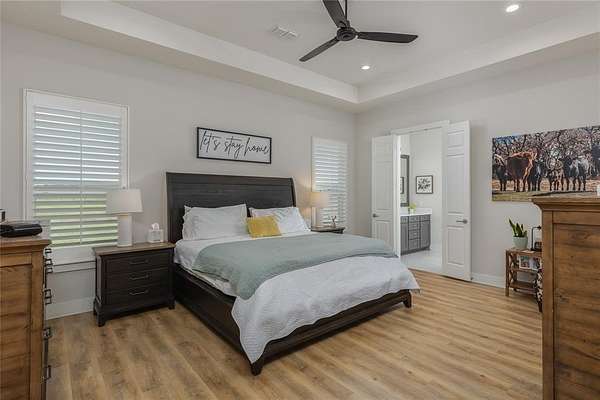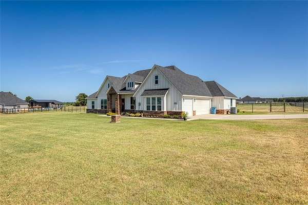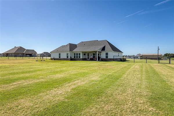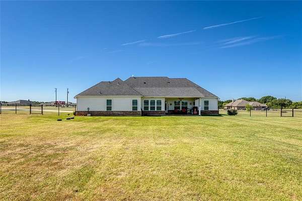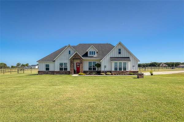 Spacious Modern Farmhouse on Acreage – No City Taxes & No HOA & Private Well—so No Water Bill! 152 Katy Ranch Drive is a beautiful home situated on a spacious corner lot in the serene outskirts of Weatherford. This thoughtfully designed residence blends modern farmhouse charm with practical features and abundant space inside and out. Inside is an inviting open floor plan where a large kitchen island with a deep farm sink is the centerpiece of the home. The kitchen is a chef’s dream, complete with custom cabinetry, quartz counters, solid backsplash, a designer vent hood, and large walk-in pantry. The kitchen flows seamlessly into the expansive living area, highlighted by a stylish shiplap fireplace with a modern electric fireplace insert, perfect for cozy evenings and entertaining guests. Just off the entry, a dedicated study with double doors provides a private work-from-home space. The mudroom with built-in lockers and bench is ideal for bookbags and shoes, and the oversized utility room offers additional built-in cabinets and space for a freezer or second fridge. The private primary suite is a true retreat, featuring a tray ceiling, plantation shutters, and a spa-like ensuite with soaking tub, dual vanities, separate shower, and a huge walk-in closet. Three additional bedrooms share a well-appointed full bath. Enjoy low-maintenance living with laminate flooring throughout the main living areas and primary bedroom, and rest easy knowing there's no HOA, spray foam insulation, no city taxes. Outside, the property boasts a top rail pipe fence with no-climb horse wire, dual gated access for a future workshop or barn site, and a beautifully manicured yard. The extra-long, oversized garage easily accommodates large Texas sized trucks and offers room for storage. Relax or entertain on the oversized covered back porch, complete with a ceiling fan. Discover the perfect balance of peaceful country living with the convenience of everything Weatherford has to offer.