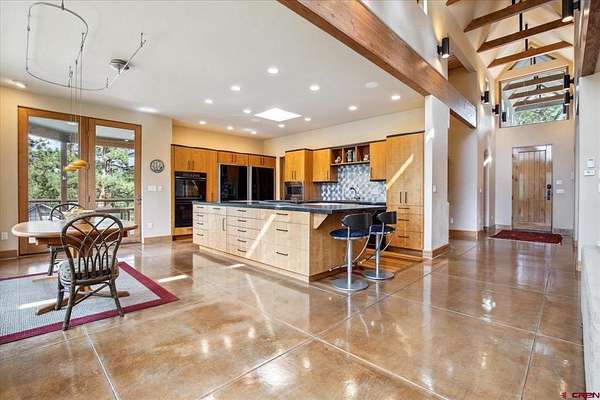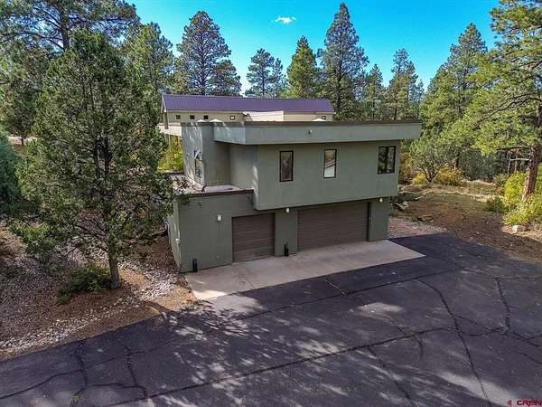 Christina M Rinderle, Durango Land and Homes, C: 970-946-2279, christina@dgohome.com, www.durangolandandhomes.com: Welcome to this meticulously crafted 4,397 sq ft residence, gracefully set on 11.26 acres within a private, gated enclave of just six homes. Designed by renowned architect Dallas Reynolds, built by Gary Whalen, and blessed by Eddie and Betty Box of the Southern Ute Tribe, this exceptional property masterfully blends artistry, functionality, with the unique feature of a large 4-person elevator, and comfort in every thoughtful detail. A flagstone patio and circular paved driveway create an inviting approach to this one-of-a-kind home. The main level opens to an elegant foyer, which leads to the open living room and kitchen offering tranquil views of the Ponderosa pines and the La Plata Mountains beyond. Art niches with recessed lighting provide subtle design accents throughout. Off the main hallway you'll find a private office, a convenient half bath, and a spacious laundry room complete with a utility sink. The primary suite serves as a luxurious retreat, featuring an attached library and dual en-suite bathrooms--each with its own vanity and walk-in closet--connected by a custom-tiled walk-in shower, heated Toto toilet with bidet, and a relaxing whirlpool bathtub. A king-sized bed with custom headboard, accent lighting, and matching side tables remains with the home, having been designed specifically to complement the space. The chef's kitchen is appointed with mahogany floors crafted from reclaimed Indonesian railroad ties, double wall ovens, a warming drawer, a five-burner cooktop with downdraft vent, microwave, and a double-drawer Fisher-Paykel dishwasher. Custom cherry cabinetry and tile countertops with two butcher block insets add both beauty and practicality. A covered deck--piped for a gas grill--offers the perfect setting for outdoor dining. The adjacent living room features a wood-burning fireplace with raised hearth, wet bar, and integrated ceiling speakers connected to a central hub for whole-home audio. An elevator conveniently services both levels of the home, enhancing accessibility and ease of living. Step lights along the staircase and dimmer switches throughout ensure comfort and ambiance. The lower level includes two additional bedrooms, each with a private sink, vanity, marble shelf, and thoughtfully placed reading lights above the beds. A full shared bathroom is located between them. One of the home's standout features is the expansive studio space--an inspiring environment for an artist, physical trainer, home gym, or any skilled professional--flooded with natural light from a wall of windows overlooking the peaceful pines. This space includes its own sink and offers endless potential as a creative workshop, fitness studio, dance room, game room, or additional living room. Throughout the home, stained and polished concrete floors with in-floor radiant heat are paired with a separate forced-air cooling system for year-round comfort. Additional features include a central vacuum system, under-stair storage, and a variety of custom built-ins designed for both beauty and functionality. The attached three-car garage includes a dedicated workshop bay equipped with multiple outlets, 220V power, an air compressor (included with the home), and newly finished epoxy flooring. A detached one-car garage with 220V power provides the perfect setup for woodworking or additional hobbies, complemented by an adjacent rear storage shed for tools and equipment. Set within a peaceful, well-maintained gated community with reliable road care and snow removal, this property ensures effortless year-round access and ease of living. Nature lovers will appreciate the abundant wildlife right outside the door, while enjoying the recreational amenities of nearby Lake Nighthorse and conveniences of historic downtown Durango, both just minutes away. Call to schedule a tour of this immaculate and beautifully designed and crafted hom