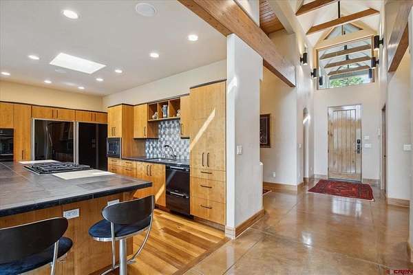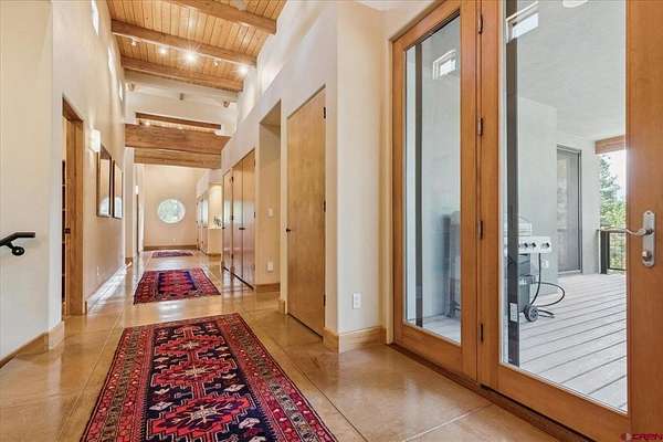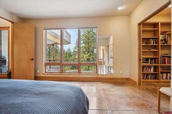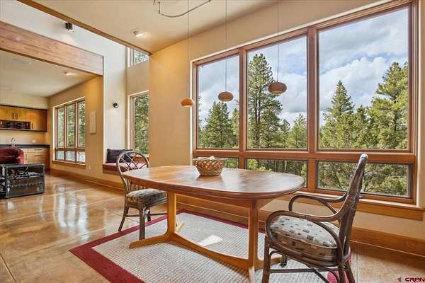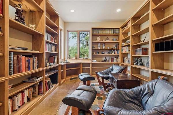 Christina M Rinderle, Durango Land and Homes, C: 970-946-2279, christina@dgohome.com, www.durangolandandhomes.com: Welcome to this meticulously crafted 4,397 sq ft residence, gracefully set on 11.26 acres within a private, gated enclave of just six homes. Designed by renowned architect Dallas Reynolds, built by Gary Whalen, and blessed by Eddie and Betty Box of the Southern Ute Tribe, this exceptional property masterfully blends artistry, functionality, with the unique feature of a large 4-person elevator, and comfort in every thoughtful detail. A flagstone patio and circular paved driveway create an inviting approach to this one-of-a-kind home. The main level opens to an elegant foyer, which leads to the open living room and kitchen offering tranquil views of the Ponderosa pines and the La Plata Mountains beyond. Art niches with recessed lighting provide subtle design accents throughout. Off the main hallway you'll find a private office, a convenient half bath, and a spacious laundry room complete with a utility sink. The primary suite serves as a luxurious retreat, featuring an attached library and dual en-suite bathrooms—each with its own vanity and walk-in closet—connected by a custom-tiled walk-in shower, heated Toto toilet with bidet, and a relaxing whirlpool bathtub. A king-sized bed with custom headboard, accent lighting, and matching side tables remains with the home, having been designed specifically to complement the space. The chef’s kitchen is appointed with mahogany floors crafted from reclaimed Indonesian railroad ties, double wall ovens, a warming drawer, a five-burner cooktop with downdraft vent, microwave, and a double-drawer Fisher-Paykel dishwasher. Custom cherry cabinetry and tile countertops with two butcher block insets add both beauty and practicality. A covered deck—piped for a gas grill—offers the perfect setting for outdoor dining. The adjacent living room features a wood-burning fireplace with raised hearth, wet bar, and integrated ceiling speakers connected to a central hub for whole-home audio. An elevator conveniently services both levels of the home, enhancing accessibility and ease of living. Step lights along the staircase and dimmer switches throughout ensure comfort and ambiance. The lower level includes two additional bedrooms, each with a private sink, vanity, marble shelf, and thoughtfully placed reading lights above the beds. A full shared bathroom is located between them. One of the home’s standout features is the expansive studio space—an inspiring environment for an artist, physical trainer, home gym, or any skilled professional—flooded with natural light from a wall of windows overlooking the peaceful pines. This space includes its own sink and offers endless potential as a creative workshop, fitness studio, dance room, game room, or additional living room. Throughout the home, stained and polished concrete floors with in-floor radiant heat are paired with a separate forced-air cooling system for year-round comfort. Additional features include a central vacuum system, and a variety of custom built-ins designed for both beauty and functionality. The attached three-car garage includes a dedicated workshop bay equipped with multiple outlets, 220V power, an air compressor (included with the home), and newly finished epoxy flooring. A detached one-car garage with 220V power provides the perfect setup for woodworking or additional hobbies, complemented by an adjacent rear storage shed for tools and equipment. Set within a peaceful, well-maintained gated community with reliable road care and snow removal, this property ensures effortless year-round access and ease of living. Nature lovers will appreciate the abundant wildlife right outside the door, while enjoying the recreational amenities of nearby Lake Nighthorse and conveniences of historic downtown Durango, both just minutes away. Call to schedule a tour of this immaculate and beautifully designed and crafted home