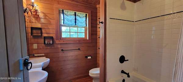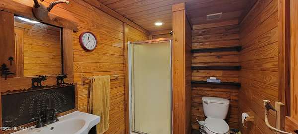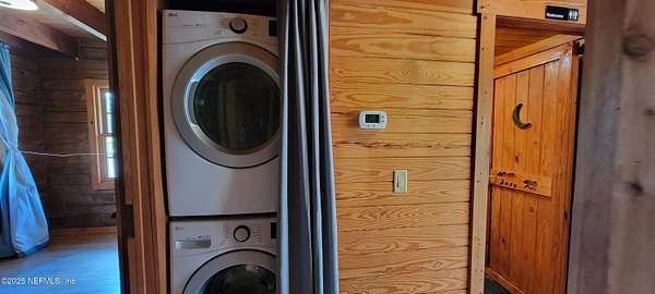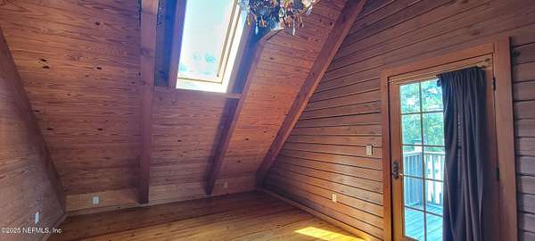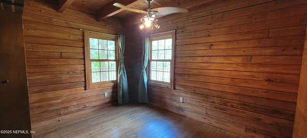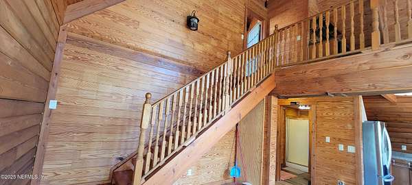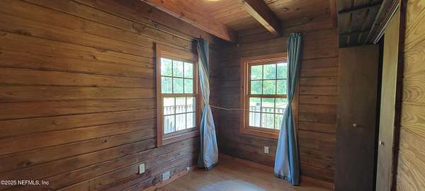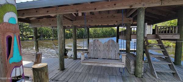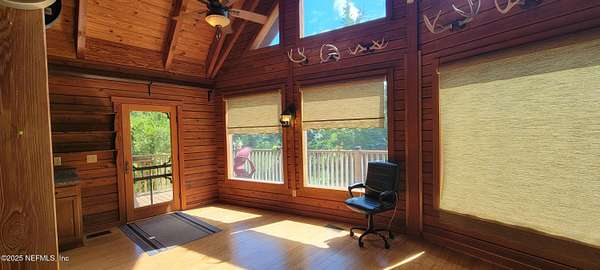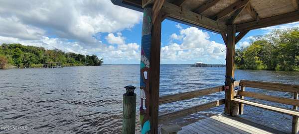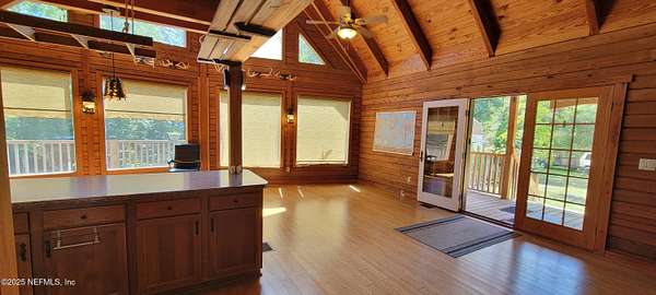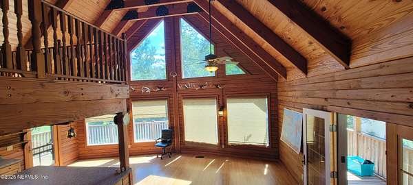 LOG CABIN - Amazing St. Johns Riverfront custom-built, 2-story A-Frame, 1469 sq. ft. log home w/22' ceiling, tongue n groove wall boards, hand crafted doors, pine & bamboo flooring plus lots of unique accents to make this a truly one-of-a-kind home. This great room concept home features floor-to ceiling windows w/privacy/sun-protection film overlooking the 700'+/- meandering boardwalk w/bench to the riverfront, an island kitchen w/lots of shelving, Whirlpool appliances to include a flat surface stove, 2 bedrooms & a bath on the 1st floor & 2nd floor master bedroom & sitting area w/wet bar overlooking the great room. The wraparound porch offers two covered seating areas. Covered boathouse w/swing & seating area, greenhouse, shed, many fruit trees & more. Bring your Boat!