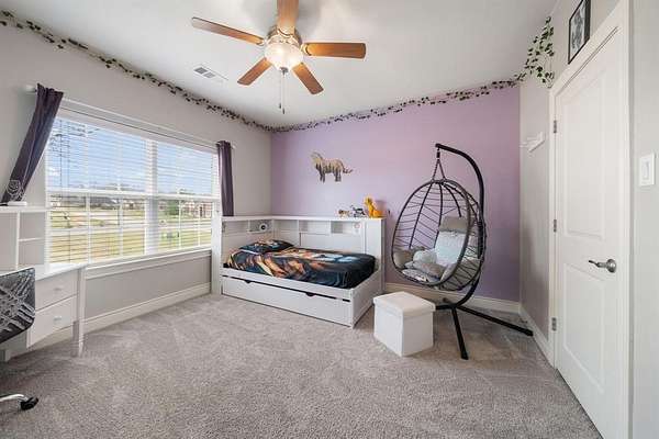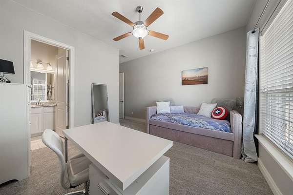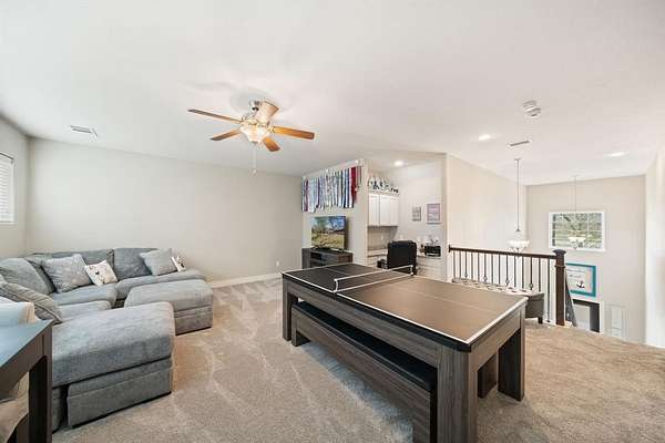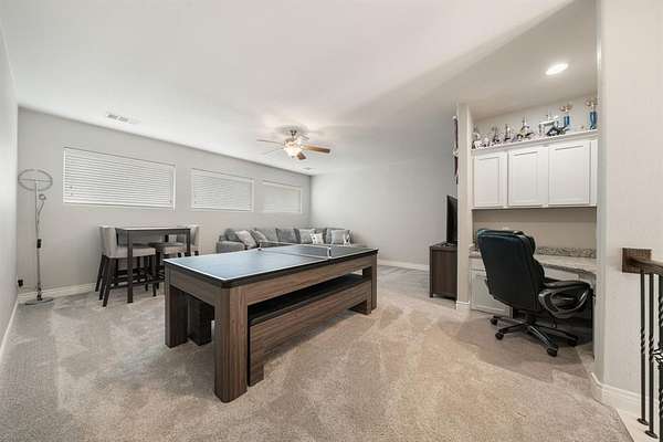Inside, you’ll find fresh interior paint (2023), new carpet in all bedrooms and upstairs areas (2023), and updated lighting that enhances the home’s warm, inviting feel. Practical design elements include a hidden built-in coat closet and a custom-designed pet retreat—perfectly integrated to create a dedicated, comfortable space for your four-legged family members without sacrificing style. A spacious game room with a built-in desk provides the ideal setup for work, study, or play.