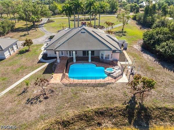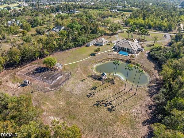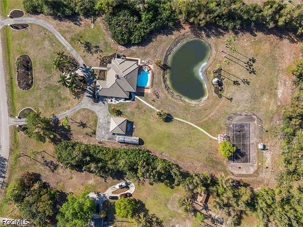 Welcome to your private Tropical Paradise on 5 ACRES nestled within Briarcliff's sought after acreage estate community centrally located in South Fort Myers. Enjoy your RESORT STYLE grounds complete with heated sparkling POOL/SPA, swaying palm trees, fruit trees, heart shapped pond, sport/tennis court easily converted to a pickleball court, charming gazebo featuring breathtaking western sunsets and great entertaining with endless possibilities. LOTS OF STORAGE! Oversized 2 car side entry garage with an additional detached garage/workshop w/ electricity and plenty of space for all of your toys, also great for the hobbyist, car enthusiast, man cave or casita! FRESH designer PAINT inside & out! The spacious family room boasts soaring vaulted ceilings, fireplace, wet bar, access to the POOL and Eat in Kitchen/breakfast nook all overlooking your private backyard oasis. The primary suite offers exterior access to enjoy late night relaxing dips in the POOL & SPA. Legacy infrastructure: This concrete block home is custom built to last & will keep the home well insulated! A whole house generator for total piece of mind. Durable tile roof (installed 2013). Newer HVAC systems for modern efficiency. This rarely available estate home on 5 Acres is located on Sweetwater Ct., a highly desired street with neighboring properties of equal upscale attributes on a no pass-through cul-de-sac road. Experience the "peace and quiet" of the country while remaining minutes from the best dining, shopping, beaches and RSW international airport. Don't miss this rare opportunity to own this unique acreage estate home in a premium zip code! A must see