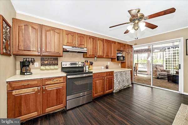 - Attic/House Fan, Carpet, Ceiling Fan(s), Combination Dining/Living, Country Kitchen, Dining Area, Family Room Off Kitchen, Galley Kitchen, Open Floor Plan, Stall Shower Bathroom, Tub Shower Bathroom, Wood Floors