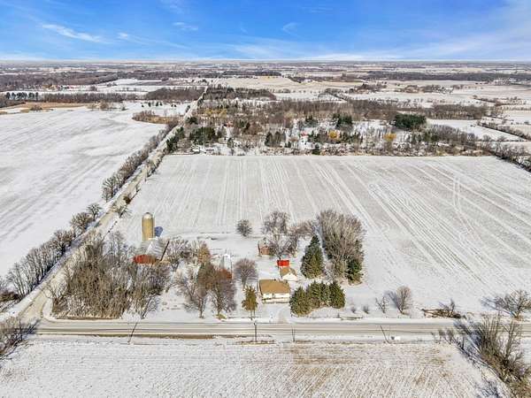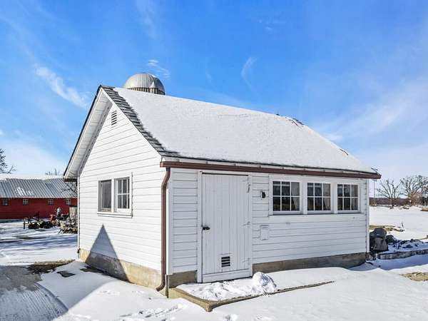 UNBELIEVABLE, PANORAMIC VIEWS OF THE COUNTRYSIDE!! First time offered, a beautiful farmette at the corner of Harmony Rd., and Seeman Road, Huntley, IL, 60142. Wonderful location, in close proximity to I-90. This property is situated on 9.96 acres. The home is well built, with an open kitchen area with loads of cabinets and window exposure, connected to a large recreation/utility area. Great 2 BR, 1 1/2 Bath Ranch home w/ a full basement and a roughed in full bath. The basement has been insulated and has all natural light exposure, exterior entrance, has great potential for a family room, possible bedroom, and a large full bath. This is a very energy efficient home, with electric baseboard heat and wood-burning furnace, which could be converted to gas. The exterior of the home is Aluminum Siding with Anderson windows and a brick patio in back. The front of the home is framed by a boulder hedge and there are other very unique features. There are outbuildings on the property, a 3.5 Car Garage, a Milk House, corn crib, silo, a windmill in need of repair, grain bin, an exceptional open center barn with a concrete floor, and metal roof. That barn is being used as a caretakers shed, and will become available after May 1, 2026. In addition, the 5 acres to the northern edge, contiguous of the property, and next to the barn, will be available for purchase for $150,000, should the buyer desire additional land. Please note that the taxes reflect a 40 acre parcel and will be revised. NOTE: No appliances are included. Property is Zoned Estate (E-2) Horses allowed!