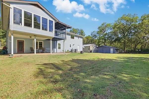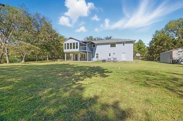 If peaceful living is what you are looking for - this may be it! This pleasant 2-story home is situated on 3.47+/- acres, making it a paradise for nature lovers. Surrounded by mature trees and a tranquil creek, this property provides a unique opportunity to enjoy quiet moments while observing deer and other wildlife. The spacious kitchen features granite countertops and plenty of counter space, serving as a central hub for family activities. It seamlessly connects to the dining area and living room, creating an ideal setting for family gatherings and entertaining guests. There is a sunroom located just off the dining area. The main bedroom and 1 bedroom are located on the main floor, the downstairs features 3 bedrooms, a full bath, and a 2nd living room/game room. There is a metal shop with a concrete floor for all your hobbies or equipment storage, and a separate building for additional storage. The roof was installed in 2022 with a platinum protection warranty that may provide additional insurance savings. The HVAC and hot water tank, providing continuous hot water, are approximately 5 years old. Conveniently located just a couple of miles from the turnpike, it offers a quick commute to Tulsa or Joplin.