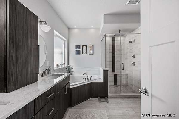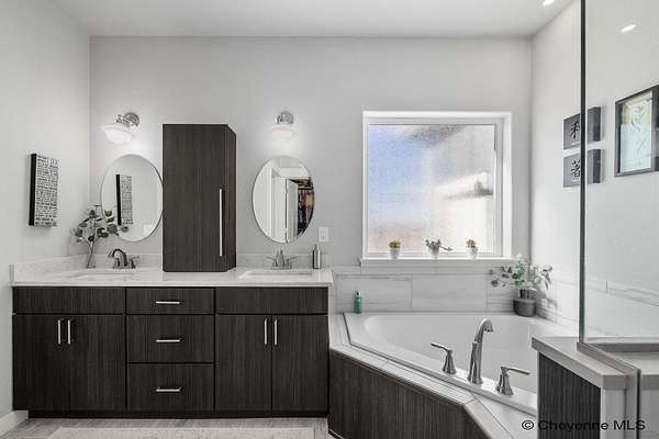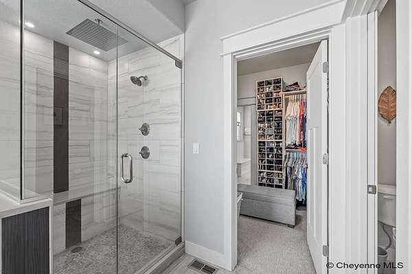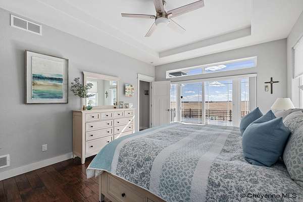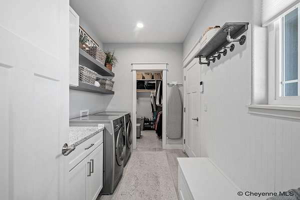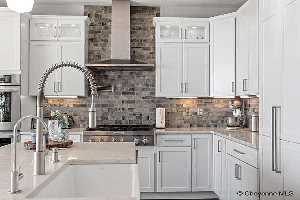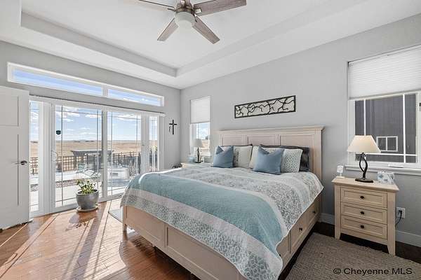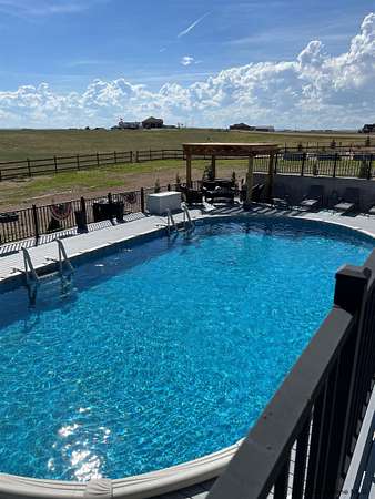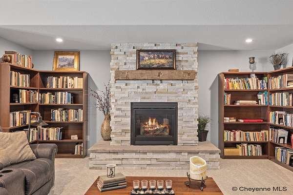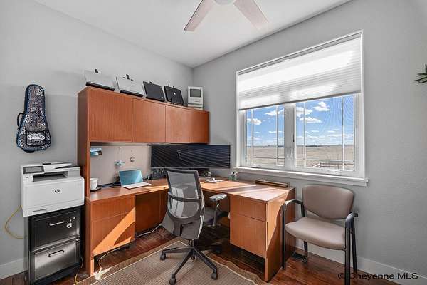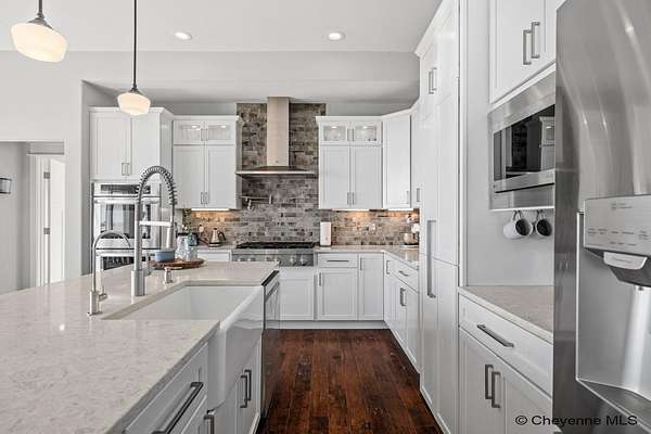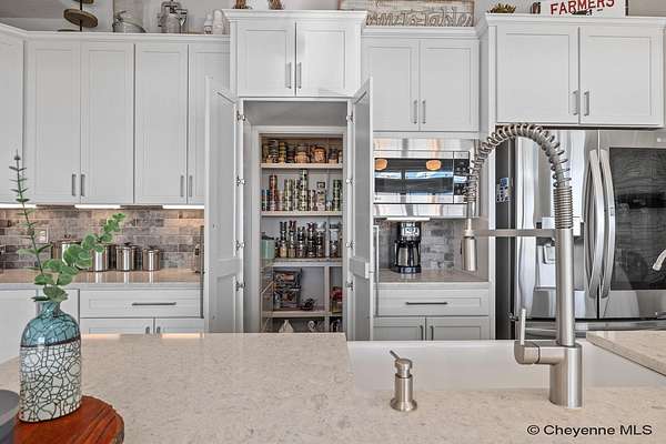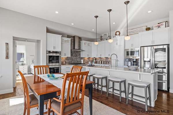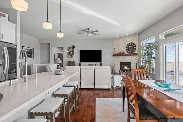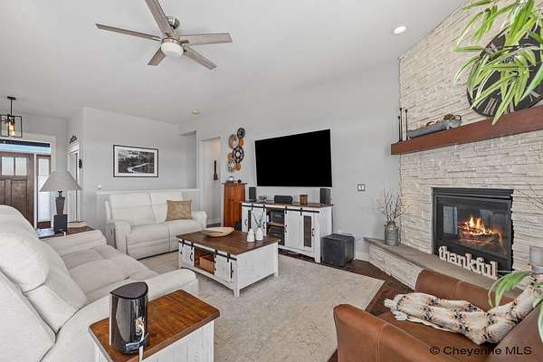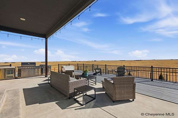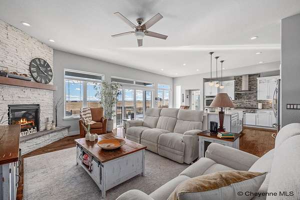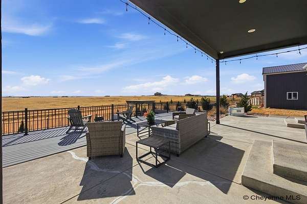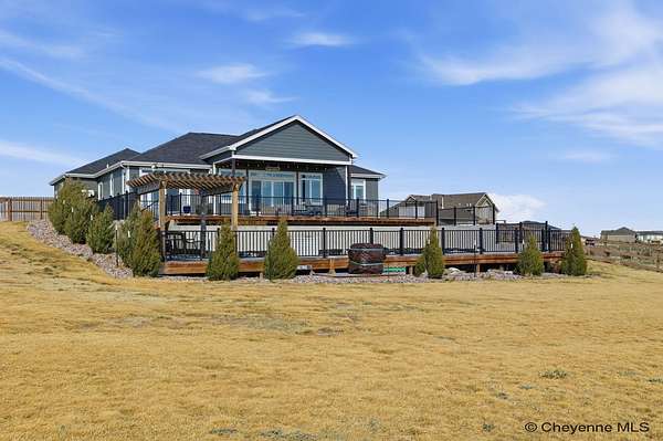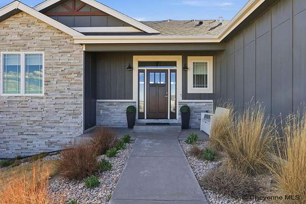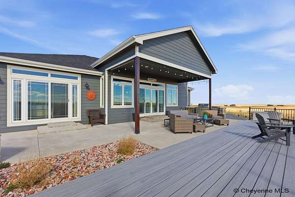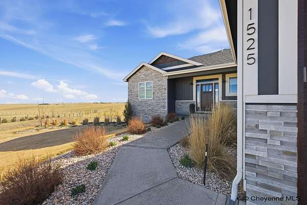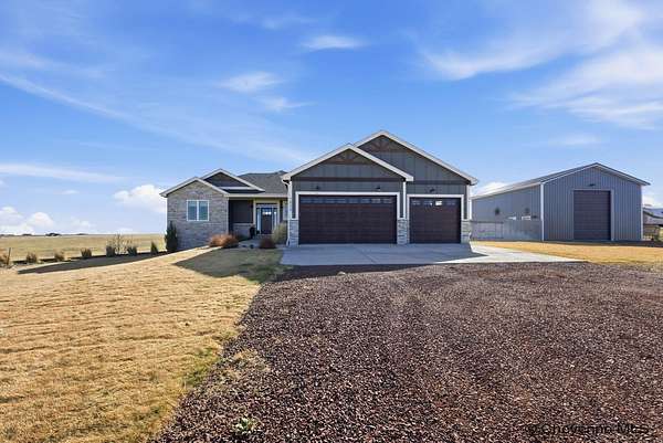 Stunning Custom Home on 5 Acres in Coveted Rocking Star Ranch! This one-owner, custom-built home showcases exceptional craftsmanship, luxury finishes, and a thoughtfully designed, energy-efficient floor plan. Featuring 6 bedrooms, 3 full bathrooms, and a spacious, oversized 3-car garage, this home offers the perfect blend of comfort, function, and high-end design in a desirable north location surrounded by rolling hills and expansive Wyoming and Colorado mountain views. The open-concept main level highlights 5-inch hickory hardwood floors, quartz countertops throughout, upgraded cabinetry, and artisan tile work. The chef’s kitchen is a true centerpiece with stainless steel appliances, a massive island, and a coveted hidden walk-in pantry with granite finishes. The Great Room features a custom stone fireplace with a hardwood mantle and flows seamlessly to a covered patio—ideal for enjoying breathtaking sunrises and sunsets. The luxurious primary suite offers a spa-like five-piece bath, generous closet space, and private outdoor access. Additional features include main-floor laundry, central A/C, Ply-Gem thermal windows, and a durable 50-year Malarkey roof. Outside, the fully landscaped 5-acre property is designed for both relaxation and function, featuring mature trees, sod, sprinkler and drip systems, RV parking with 30-amp service, and a gated, fully fenced layout with a separate dog yard. Enjoy summer days in the large, heated outdoor pool surrounded by Trex decking and an impressive pergola. The fully insulated outbuilding/pole barn with a 16’ door and opener provides excellent space for equipment, hobbies, or storage. The home also plumbed for whole-house generatioin with natural gas for added peace of mind. The walkout basement offers additional living space, a large family room with a second custom fireplace, and ample room for expansion or storage. Combining space, scenery, and modern luxury, this exceptional property is move-in ready and designed for Wyoming living at its finest.