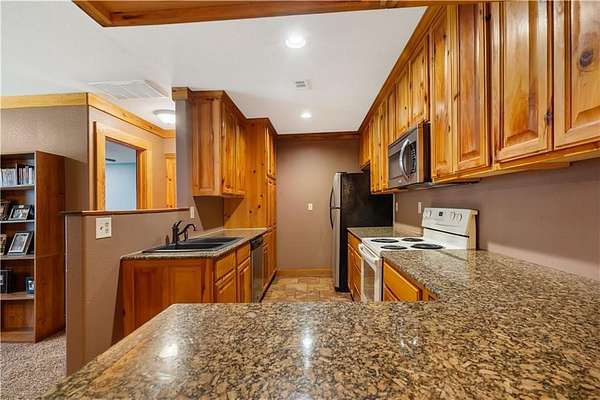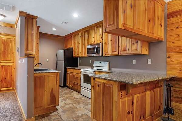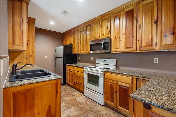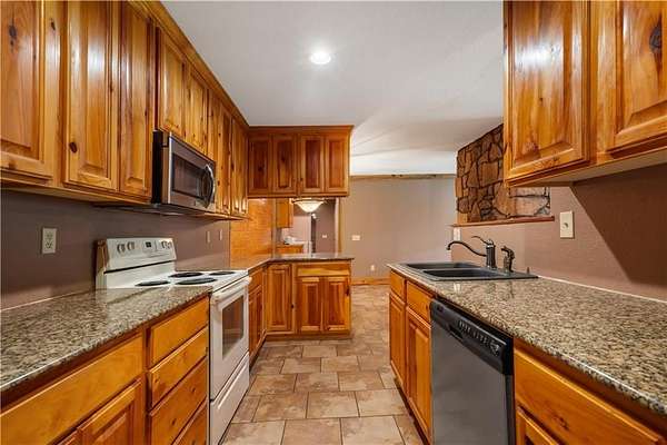 - Blinds, Ceiling Fans, Granite Counters, Smoke Detector, Split Floor Plan, Woodstove