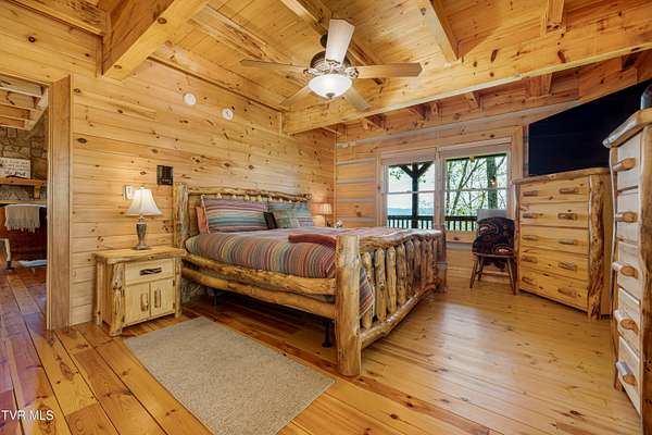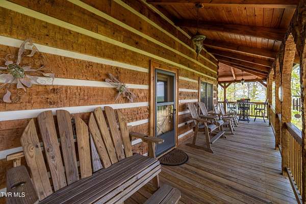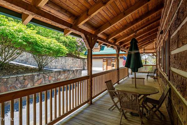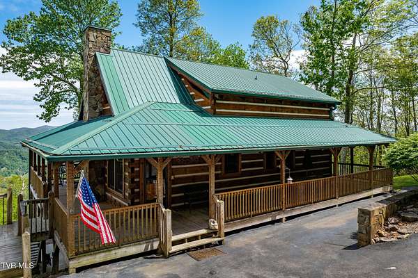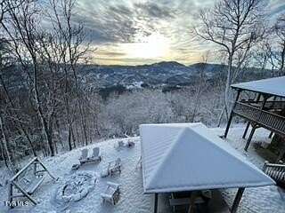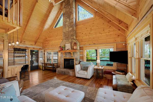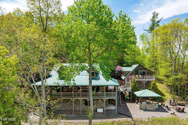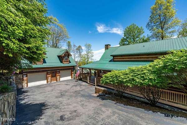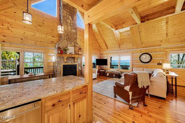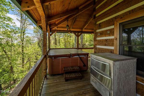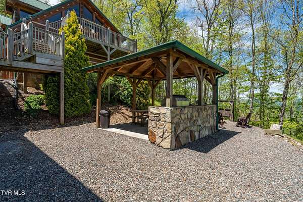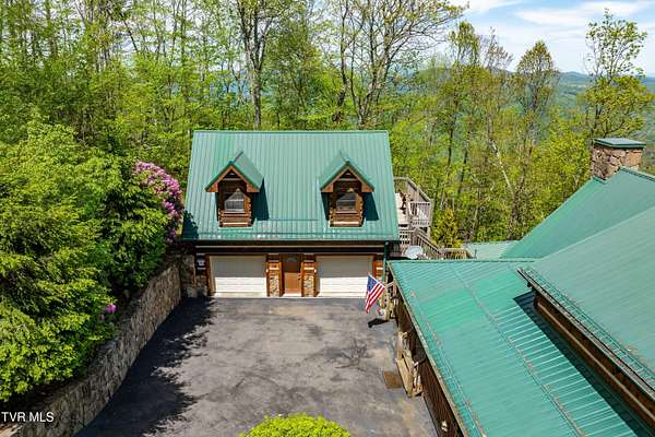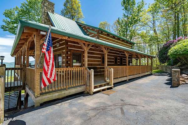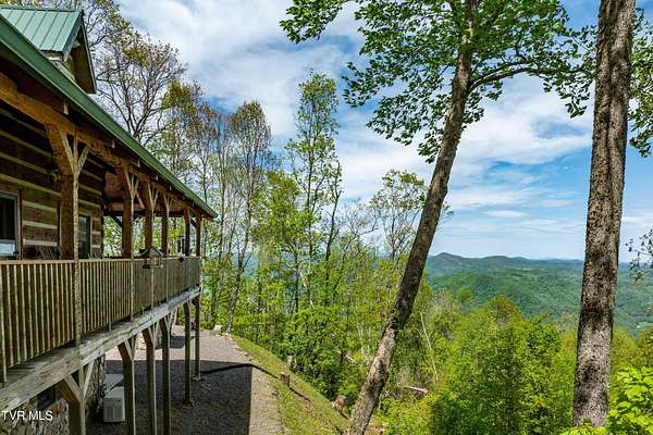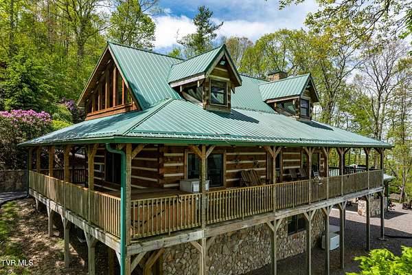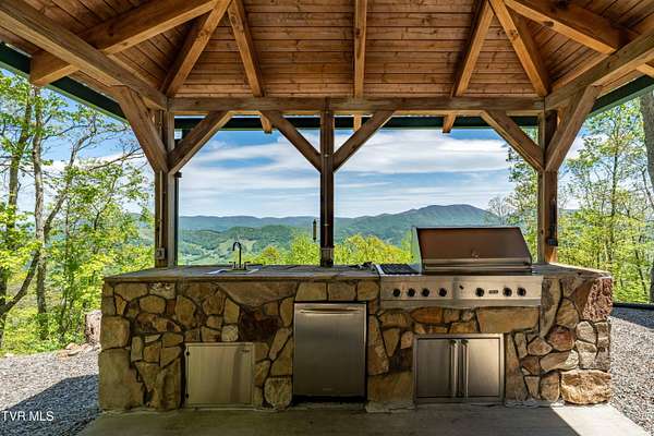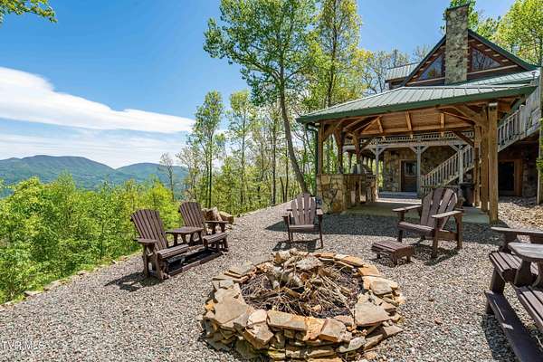 Resting at an elevation of 4,233 feet, this stunning custom hand-hewn log home offers panoramic views of the mountains of North Carolina, Tennessee, and Virginia. The generous great room features a dramatic floor-to-ceiling stone fireplace with gas logs, flowing seamlessly into a chef's kitchen equipped with Jenn Air stainless steel appliances, granite countertops, and custom cabinetry. The main-level primary suite boasts double vanities and serene mountain views. Upstairs, a versatile loft space-perfect for a home office-complements a large, light-filled bedroom and a full bath. The lower level is an entertainer's dream, featuring a custom granite-topped bar, a second gas fireplace, a handcrafted pool table, and an intimate wine cellar and tasting room with custom cabinetry. A bonus/sleeping room (currently used as a bedroom) and a full bath complete this level. Above the two-car garage is a 780 sq ft guest apartment currently operating as an Airbnb. It includes a king-size bed, cozy sitting area with gas fireplace, kitchenette, and full bath-ideal for guests or rental income. Exceptional outdoor amenities include a 1,490 sq ft covered wrap-around deck, a covered outdoor kitchen with a 52'' Viking gas grill, refrigerator, sink, fire pit, and an 8-person hot tub-all designed to take full advantage of the breathtaking scenery. Practical features include a propane-powered whole-house generator, metal privacy gate, water filtration and softening system, exterior security cameras, and tasteful outdoor lighting. Located near the NC High Country with the benefit of lower taxes and county-maintained roads. Furnishings & an ATV convey with an acceptable offer. Whether you're seeking a primary residence, second home, or income-producing rental, this property delivers unmatched luxury, comfort, and views. Seller's plans have changed. Call today for your private tour. Information sourced from tax & seller's information. Buyer/buyer's agents encouraged to verify.