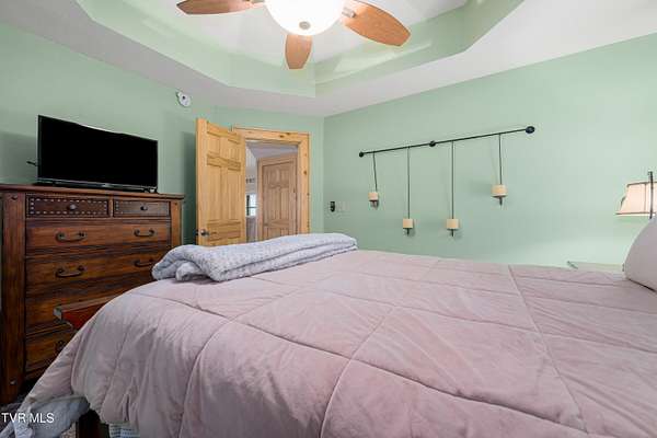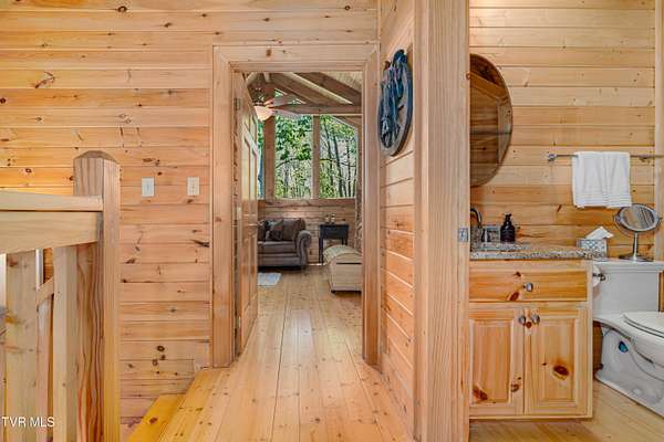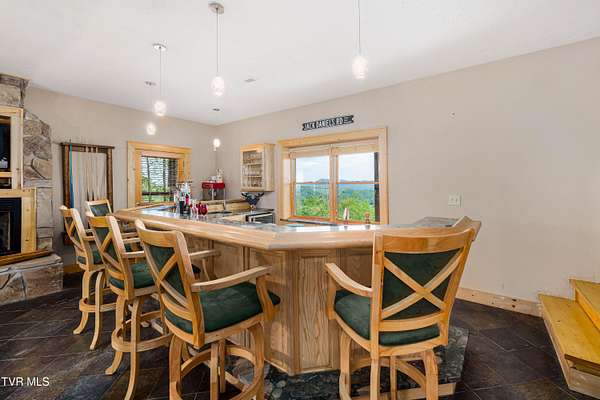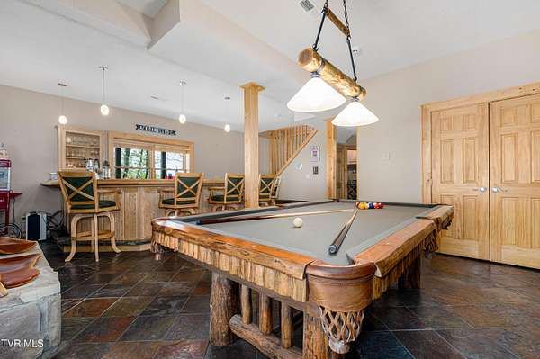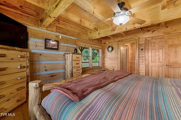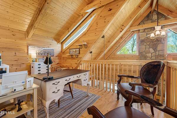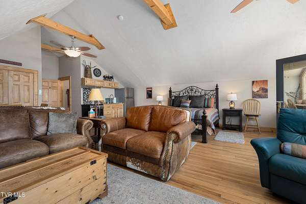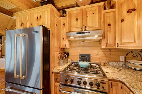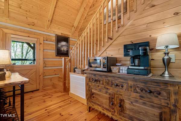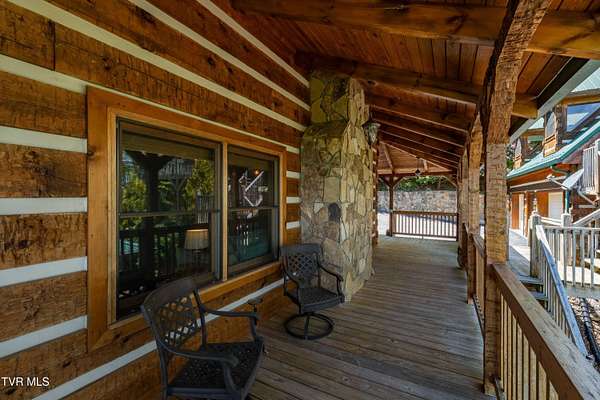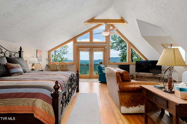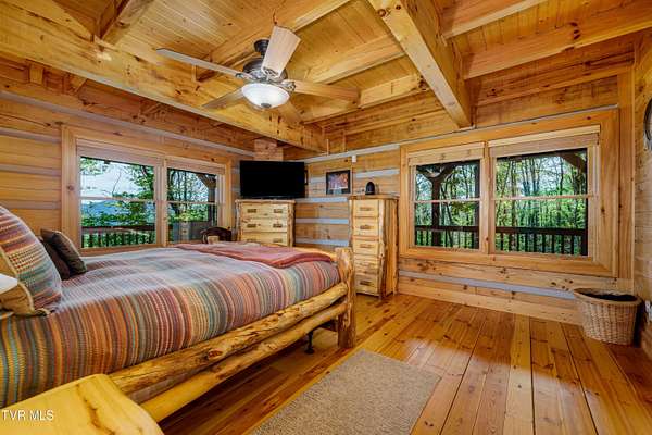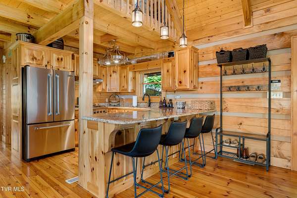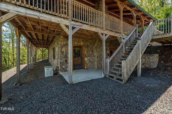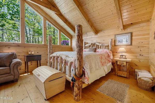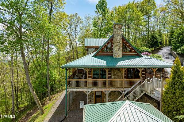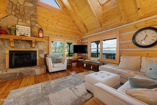 Resting at an elevation of 4,233 feet, this stunning custom hand-hewn log home offers panoramic views of the mountains of North Carolina, Tennessee, and Virginia. The generous great room features a dramatic floor-to-ceiling stone fireplace with gas logs, flowing seamlessly into a chef's kitchen equipped with Jenn Air stainless steel appliances, granite countertops, and custom cabinetry. The main-level primary suite boasts double vanities and serene mountain views. Upstairs, a versatile loft space-perfect for a home office-complements a large, light-filled bedroom and a full bath. The lower level is an entertainer's dream, featuring a custom granite-topped bar, a second gas fireplace, a handcrafted pool table, and an intimate wine cellar and tasting room with custom cabinetry. A bonus/sleeping room (currently used as a bedroom) and a full bath complete this level. Above the two-car garage is a 780 sq ft guest apartment currently operating as an Airbnb. It includes a king-size bed, cozy sitting area with gas fireplace, kitchenette, and full bath-ideal for guests or rental income. Exceptional outdoor amenities include a 1,490 sq ft covered wrap-around deck, a covered outdoor kitchen with a 52'' Viking gas grill, refrigerator, sink, fire pit, and an 8-person hot tub-all designed to take full advantage of the breathtaking scenery. Practical features include a propane-powered whole-house generator, metal privacy gate, water filtration and softening system, exterior security cameras, and tasteful outdoor lighting. Located near the NC High Country with the benefit of lower taxes and county-maintained roads. Furnishings & an ATV convey with an acceptable offer. Whether you're seeking a primary residence, second home, or income-producing rental, this property delivers unmatched luxury, comfort, and views. Seller's plans have changed. Call today for your private tour. Information sourced from tax & seller's information. Buyer/buyer's agents encouraged to verify.