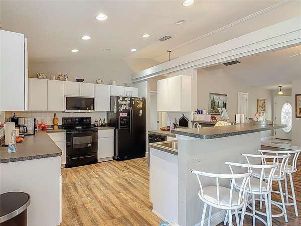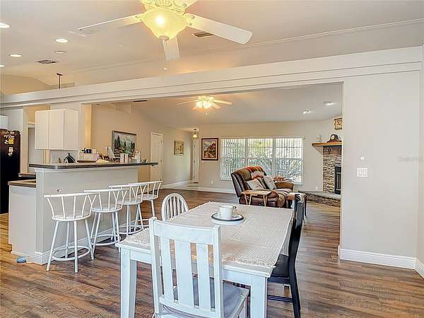 The kitchen offers ample cabinetry, bar seating, and an eat-in area, providing both functionality and workspace for everyday living or entertaining. The split-bedroom layout provides privacy, with the primary suite featuring a walk-in closet and walk-in shower, while two guest bedrooms and a hall bath are located on the opposite side of the home.