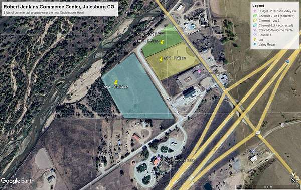Est $9,126/moOffering 3 commercial lots just off I-76 at the Julesburg interchange near the new Cobblestone hotel, and adjacent to the south bank of the South Platte River. Lot 1 at the north end of Robert Jenkins Street has 3.53 acres ready for development. Lot 2 has 7.46 acres and sits north of the Platte Valley Inn. Both lots 1 and 2 have frontage on US Highway 385. Lot 4 has 13.64 acres and sits on the west side of Robert Jenkins Street, across from the Colorado Welcome Center. River views on Lot 1 and Lot 4. Also priced individually at:Lot 1 $1.50 per square foot $230,650 Lot 2 $1.50 per square foot $487,436 Lot 4 $1.00 per square foot $594,158