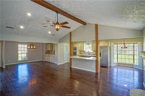 Situated on 3.75 acres along Highway 30 between College Station and Huntsville, this property offers the perfect balance of peaceful country living and convenient access to town. Mature hardwood trees surround the home, creating a quiet and scenic setting. The 1,747 sq ft home features 3 bedrooms and 2 bathrooms with an open floor plan and cathedral ceiling that gives the main living area a spacious feel. Interior finishes include wood flooring, quartz countertops, designer cabinetry, and a large pantry. A whole-home generator adds an extra level of reliability and peace of mind. Outside, a large patio overlooks the stocked pond, providing a great place to relax, entertain, or enjoy a little fishing. The property also includes a barn and a detached garage with a 442 sq ft apartment and half bath, offering flexible space for guests, a home office, game room, or additional storage. With direct Highway 30 frontage and located in the Anderson-Shiro ISD, this property offers both comfortable country living and excellent future potential.