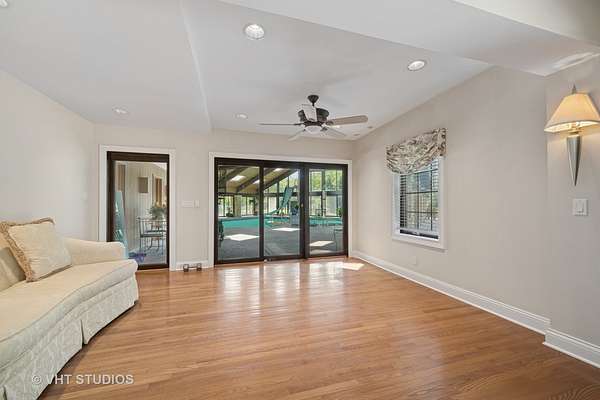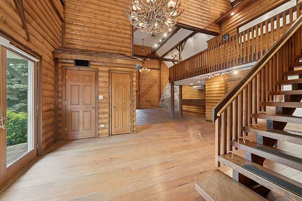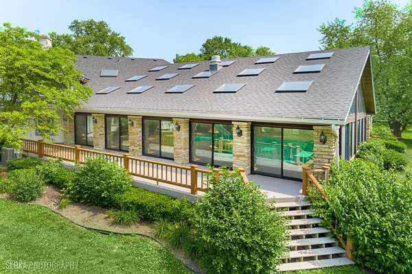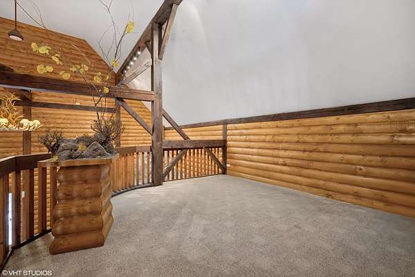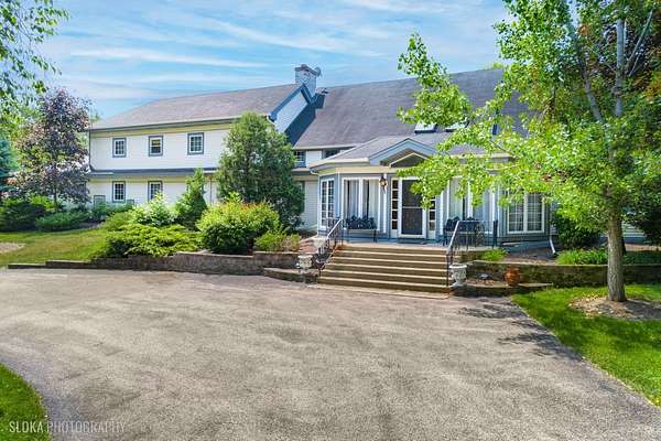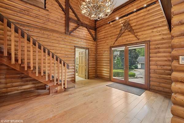 A rare opportunity to own 20+ prime acres in sought-after Barrington Hills! This exceptional 9,000+ sq ft estate offers resort-style living with an incredible indoor pool, expansive living areas, and a separate log-cabin-style guest house-all set amidst serene countryside. The main residence features 5 bedrooms and 7 full baths, including a convenient main-floor suite with ensuite bath, ideal for one-level living. The dramatic great room is a showstopper with soaring tongue-and-groove vaulted ceilings and a striking floor-to-ceiling, four-sided stone fireplace. An adjacent family room with sliders to the patio creates a seamless flow for entertaining. The light-filled kitchen offers abundant cabinetry and counter space, opening to the great room and flowing into a spacious dining room with picturesque views of the backyard. A separate living room and sitting area lead to the indoor pool retreat, complete with vaulted ceilings, skylights, hot tub, slide, walls of sliding glass doors, and a spiral staircase to a second-floor bonus room. Additional highlights include a main-level sauna bath off the game room and a private second floor primary suite with French door entry, vaulted ceilings, a large walk-in closet/dressing room, and a spa-like ensuite. Upstairs, you'll find three generous secondary bedrooms-including a second primary suite-and three full baths. The property includes a barn with a stunning 3,000+ sq ft "Yellowstone-style" log cabin guest house offers 2 bedrooms, 2 full baths, an office, soaring beamed great room with floor-to-ceiling fireplace, and full kitchen-perfect for guests, extended family, or private retreats. An attached outbuilding features a two-stall barn with tack room, along with ample space for equipment and service vehicles. Garage space abounds with a 3-car attached garage and a detached 6-car garage that can accommodate up to 10 vehicles. Whether you're dreaming of a family compound, equestrian estate, or hobby farm, the possibilities here are endless. All this in the award-winning D220 school district and just minutes to charming downtown Barrington, Metra, restaurants, and shopping.