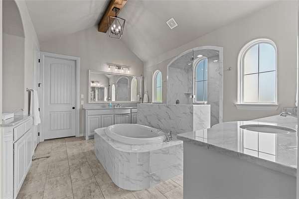 The primary suite is an oversized retreat featuring a spa-like bathroom with a soaking tub, marble accents, dual vanities with a dedicated makeup vanity, and large custom walk-in closets. Three additional bedrooms provide flexibility for family or guests. Bonus spaces include a man cave or media room, home office or playroom, and a flex space off the garage ideal for a home gym, workshop, or storage.