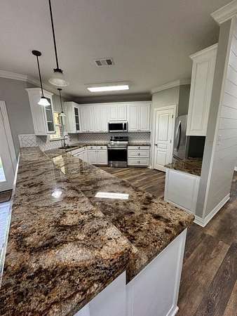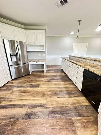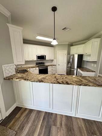 - Eat-in kitchen boasting granite countertops, electric cooktop, oven with air frying capability, dishwasher, disposal, stainless steal fridge, and microwave- all ready for family gatherings or casual meals.