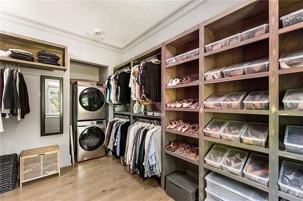 The main-level primary suite is a true retreat, with vaulted 17-foot ceilings and a dramatic wall of windows overlooking the lake. Enjoy private access to the back porch and a spa-inspired bath w/ a freestanding soaking tub, oversized dual shower, separate vanities, dual water closets, and custom his-and-her closets with a private washer & dryer. The ultimate in convenience.