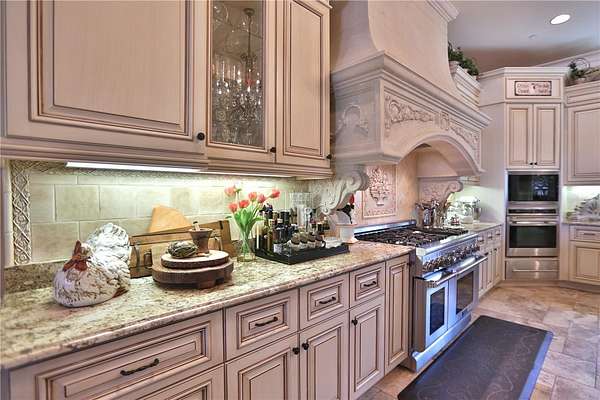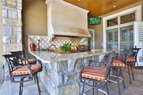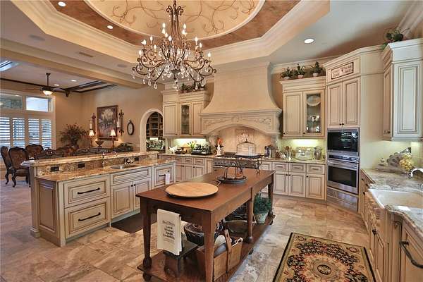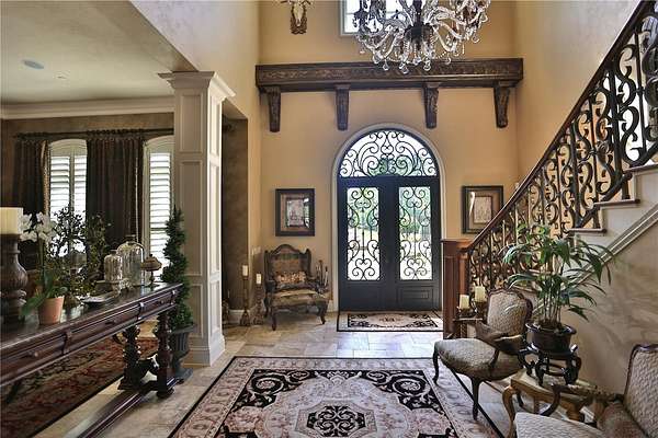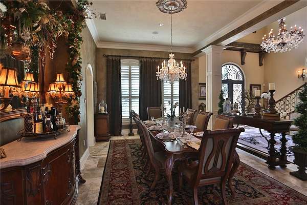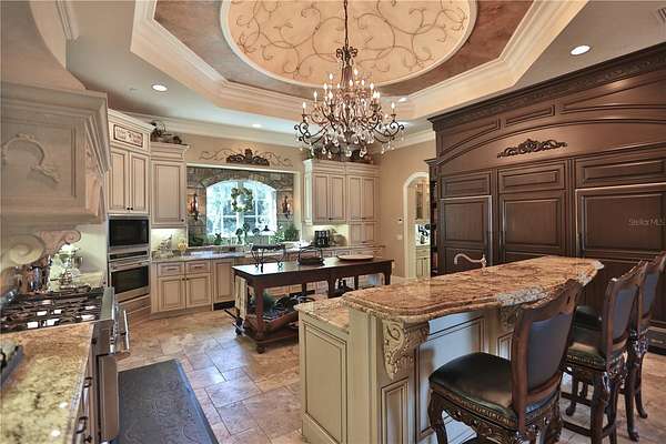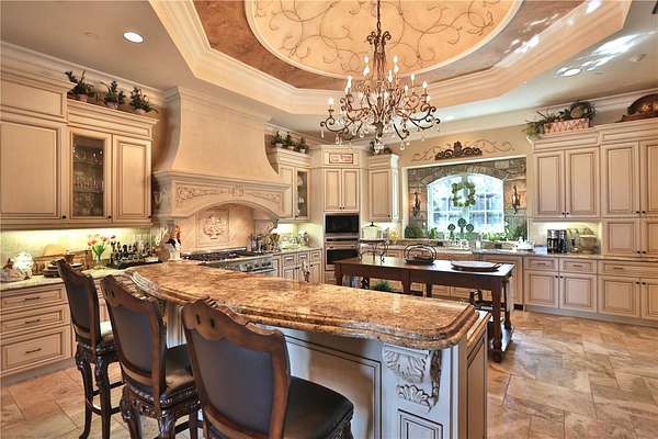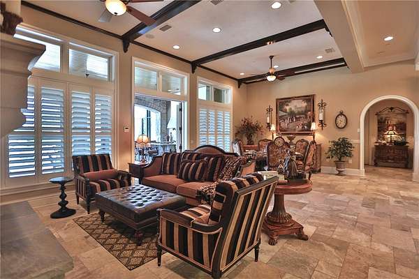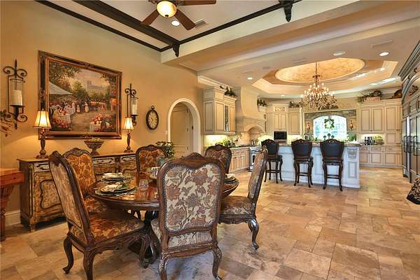 - Built-In Features, Cathedral Ceiling(s), Ceiling Fans(s), Coffered Ceiling(s), Crown Molding, Eat-In Kitchen, High Ceilings, Open Floorplan, Primary Bedroom Main Floor, Solid Surface Counters, Solid Wood Cabinets, Split Bedroom, Stone Counters, Walk-In Closet(s), Window Treatments