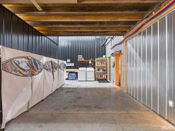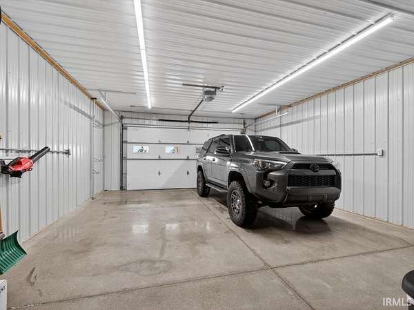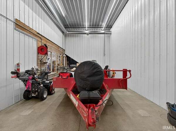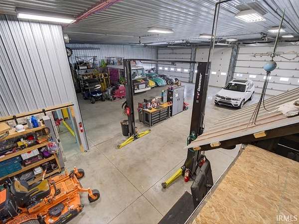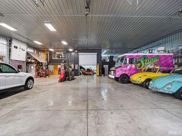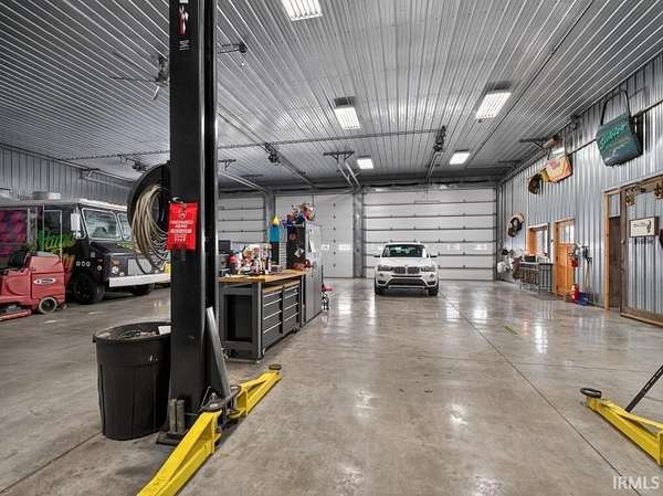 Luxury Barndominium on 2 Acres with Commercial-Grade Pole Barn. Completed just four years ago, this exceptional barndominium sits on a 2-acre lot with city water and sewer, offering 2,500 sq ft of upscale living space paired with an impressive 11,000 sq ft fully finished pole barn. A rare blend of luxury living, expansive functional space, and outstanding business or hobby potential. The pole barn features 16-foot ceilings, three 14-foot exterior doors, a 10,000-lb two-post car lift, and over 2,700 sq ft of polished concrete floors--ideal for automotive enthusiasts, contractors, collectors, or commercial use. Approximately 2,400 sq ft currently carries a light commercial variance with signage; a new owner must reapply through Allen County to continue commercial use. Additional features include a second-story man cave overlooking the shop, a finished half bath, washer and dryer, a dedicated mechanical room with built-in air compressor and plumbed air drops, and 400-amp electrical service. Both the home and barn are constructed with 2x6 walls, high/low-density spray foam insulation, and radiant floor heating powered by a shared high-efficiency two-zone boiler system. This system also provides on-demand domestic hot water with a recirculation line for near-instant hot water throughout the property. The home offers 10-foot ceilings, solid surface flooring, premium countertops, and high-end appliances. Comfort is enhanced by a two-zone Carrier AC system and Aprilaire steam humidifier. Additional highlights include a natural gas fireplace, 8-foot Andersen 400 Series windows and doors, remote-controlled blinds, and automated Lutron lighting. The gourmet kitchen features a large granite island, premium appliances, and a pot filler. The home includes three bedrooms and two full baths, including a primary suite with a walk-in tiled shower. Outdoor living shines with a large covered porch, built-in gas grill, and custom concrete countertop. The backyard retreat includes a heated 18' x 36' in-ground concrete pool with tanning ledge, slide, water features, and automated safety cover. Additional features include whole-property Wi-Fi, two automated gated driveways, a 32+ zone security system, and a fully climate-controlled barn. This one-of-a-kind property must be seen to truly appreciate its scale, craftsmanship, and possibilities.