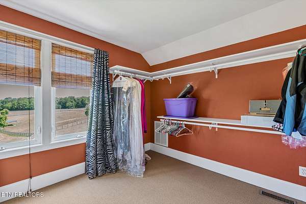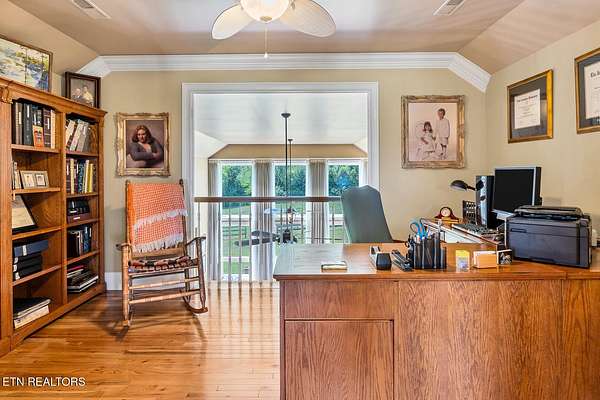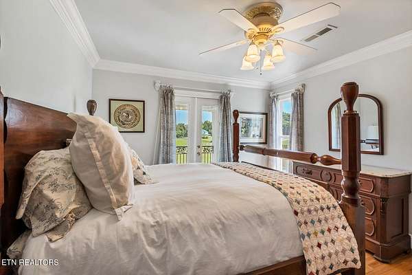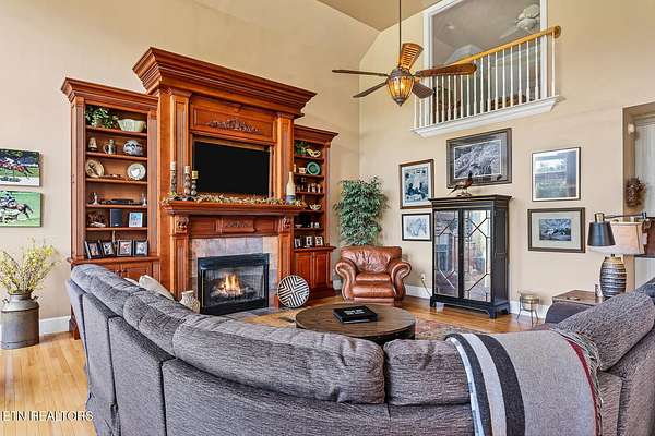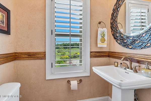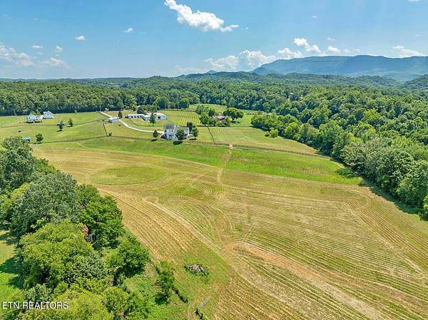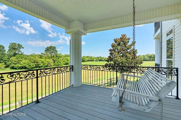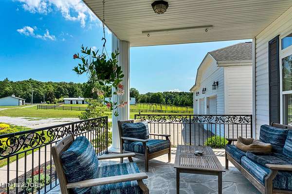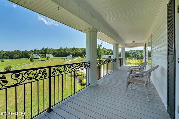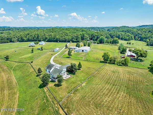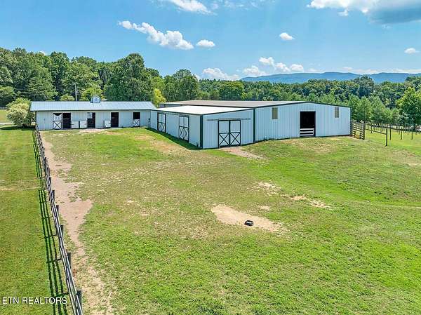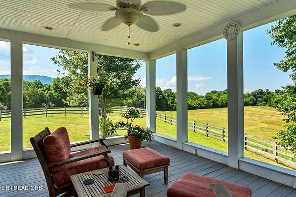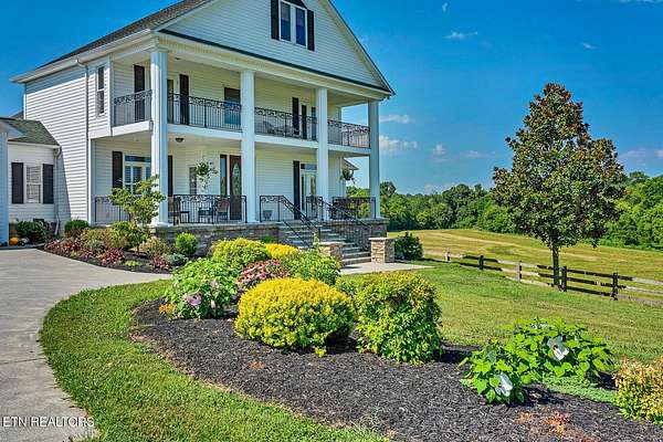 Discover this stunning equestrian property nestled at the foothills of the Great Smoky Mountains where spectacular mountain views create a breathtaking backdrop for country living. This turnkey farm spans 23 rolling acres, completely fenced with a year-round creek and secured by a gated entrance. The elegant antebellum-style home welcomes you with its impressive design and thoughtful layout. Inside, you'll find a gourmet kitchen perfect for cooking enthusiasts, paired with a spacious formal dining room for memorable gatherings. The living room features custom built-ins and soaring vaulted ceilings that create an inviting atmosphere. The main level includes an updated master suite with private balcony access, offering breathtaking views of the pastures and mountains beyond. The versatile floor plan extends to a fully finished basement complete with its own kitchen, living area, exercise room, bedroom, and patio access. This space works perfectly as an in-law suite or additional family quarters. Horse lovers will appreciate the comprehensive equestrian facilities. The property includes a fully enclosed arena with premium rubber and sand footing suitable for various riding disciplines. Four interconnected pastures feature automatic waterers and run-in sheds for livestock comfort. Two well-appointed barns provide eight matted stalls, each equipped with electricity and direct turnout access. Additional amenities include a spacious tack room with custom cabinetry, multiple feed rooms, and ample storage areas. A large storage building offers ideal space for hay storage or equipment parking. As an added bonus, the property includes a two-acre vineyard site ready for planting. This exceptional Smoky Mountain horse farm combines luxury living with professional-grade equestrian amenities all enhanced by spectacular mountain views.