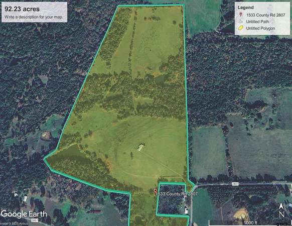 Est $3,085/moCountry living with land, water, and elbow room. This 92.23-acre tract in Alto includes a 3 bedroom, 2 bath mobile home on a hilltop, plus an extra-large covered parking area that's perfect for your work trucks, boat, trailer, or tractor. The property has rolling hills, a creek, and two ponds--one approx. 2 acres and another about 0.30 acre--so you've got water for livestock and a good spot to fish. With two access points on County Road 2807, you've got options for how you use the land. Great for grazing, hunting, ATVs, and making it your own piece of East Texas.