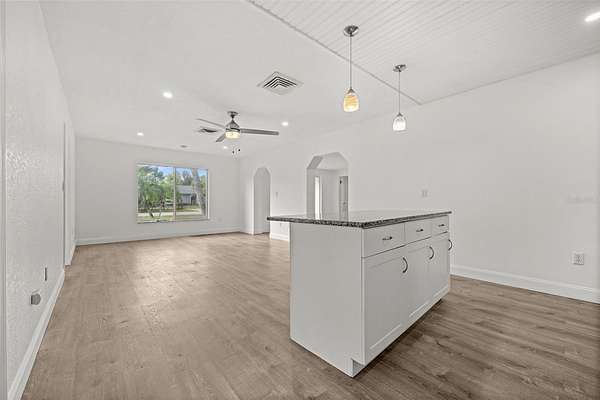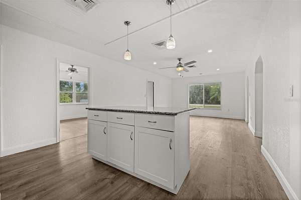 - Built-In Features, Ceiling Fans(s), Eat-In Kitchen, Kitchen/Family Room Combo, Open Floorplan, Primary Bedroom Main Floor, Split Bedroom, Stone Counters, Thermostat, Walk-In Closet(s)