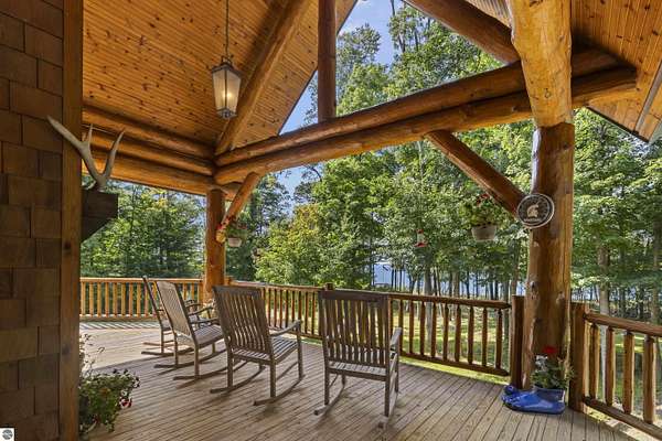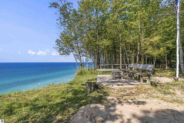 Perched above Lake Michigan, this home offers wooded privacy, endless sunsets, and a setting that feels both peaceful and inspiring. A scenic path leads to a bluff-top overlook, where the lake stretches out before you like a private show every evening. The large covered deck and expansive windows frame spectacular views of Lake Michigan, making it the ultimate backdrop for entertaining and relaxation. Inside, the design is warm and welcoming, with soaring ceilings, a floor-to-ceiling stone fireplace, custom hickory cabinets, and hardwood floors. The architecture showcases massive whole-log timbers and natural wood details, giving the home both strength and character. The main living spaces flow easily, with an open layout, a custom spiral staircase, and main-floor living for everyday convenience. The walk-out lower level adds a kitchenette, game area, and extra space for guests. Practical comforts are here too: natural gas heat, a backup generator, two laundry areas, and a two-car garage. Outdoors, you'll find a fire pit for evening conversations under the stars. Life here is about connection to nature--watching eagles teach their young to fly, listening to the surf and wind in the trees, smelling wild leeks in spring, and soaking in the brilliant colors of fall. In winter, the quiet of fresh snow makes the setting even more magical. And when you're ready to explore, world-renowned Arcadia Bluffs Golf Club--with three courses--is just minutes away. Crystal Mountain, with its championship golf and winter skiing, is less than half an hour's drive. Beaches, marinas, and other adventures are all close at hand. This is more than a home--it's a place where nature, comfort, and recreation come together with beautiful views of the lake. Shown by Appointment Only-No Drive-by Viewings Please.
