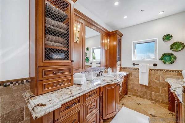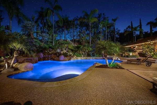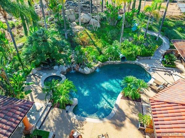 Prepare to be captivated by Blossom Valley's most exceptional estate, a privately gated sanctuary that redefines Southern California living. From the moment you enter through the grand gates, you are greeted by a sprawling 6.54-acre estate, offering unparalleled privacy and space. This estate is meticulously designed for both lavish gatherings and intimate celebrations, making it a true entertainer's paradise. The heart of this home is a chef's dream kitchen, featuring a huge prep island with a custom decorative extra-thick granite slab, a professional Wolf range, & Sub-Zero refrigerator, ensuring every culinary endeavor is a delight. The sophisticated 600 bottle Wine Cellar, an ideal for tastings and storing your prized collection. Featuring a Separate Guest House, perfect for visitors or extended family. An impressive 2 RV garage 40' wide by 50' long, with man cave/workshop & bathroom. The game room provides endless entertainment possibilities. The outdoor oasis features a magnificent Resort-Like Pool and Spa with enchanting waterfalls and an exhilarating 90-foot Waterslide, promising endless fun and relaxation. The Entertainment Pavilion features a full Kitchen, Living Room w/ cozy wood-burning Fireplace. Sports enthusiasts will appreciate the private Sport Court with tennis & pickleball. Inside, the master suite offers a sanctuary of luxury, complete with a Jacuzzi tub w/ fireplace, & a steam shower/sauna featuring aromatherapy for ultimate rejuvenation. Equipped w/ a state-of-the-art 108 panel solar system for energy efficiency and pool solar for year-round enjoyment.