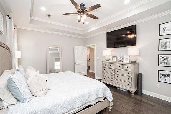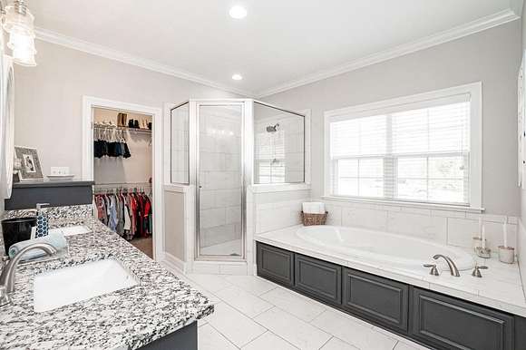 - Crown Moulding, Granite Counter Tops, His & Hers Walk-In Closets, Lighting Recessed, Newly Painted, Open Floor Plan, Pantry, Separate Shower Primary, Specialty Ceilings, Split Floor Plan, Walk-In Closets, Wide Baseboard