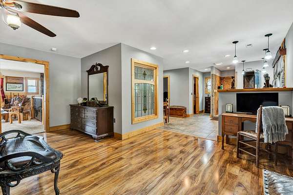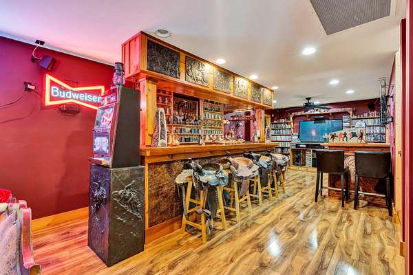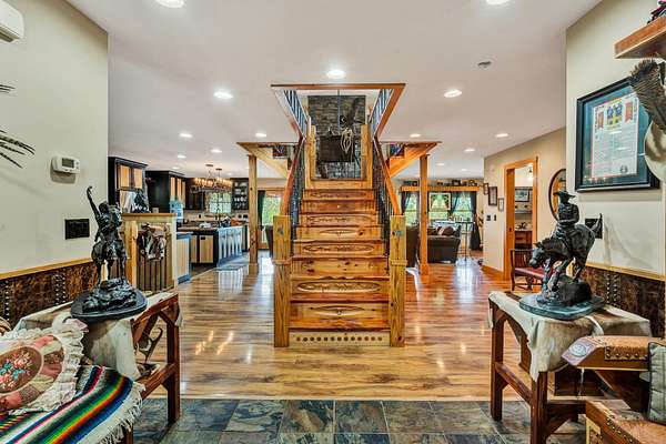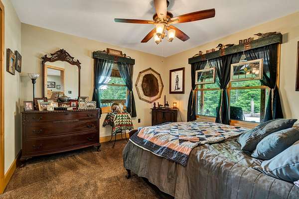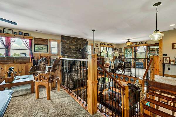 The open-concept living room and kitchen provide the perfect gathering space, highlighted by two fireplaces that create a cozy mountain ambiance. Step outside to the wrap-around porch and take in the peaceful surroundings, or head downstairs to the walk-out basement complete with a wet bar and plenty of room for entertaining. Outdoors, enjoy two gun ranges, a greenhouse, and a small pond, ideal for those who appreciate nature and self-sufficient living.