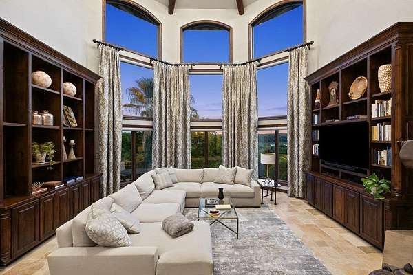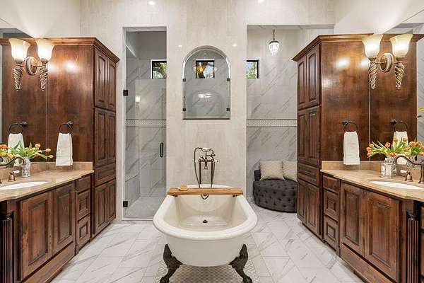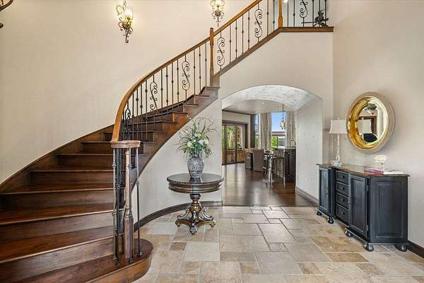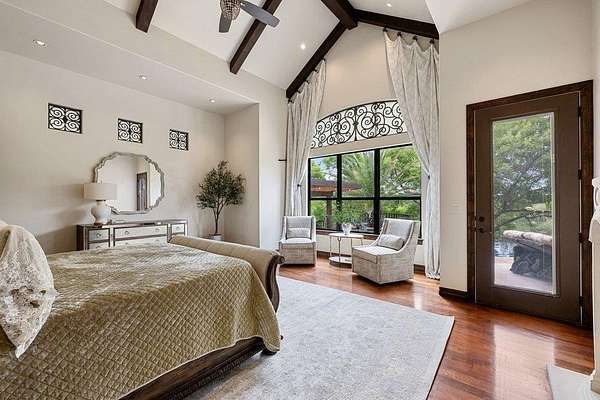 - Bar, Beamed Ceilings, Bookcases, Breakfast Bar, Built-In Features, Cathedral Ceiling(s), Ceiling Fan(s), Ceiling-High, Ceiling-Vaulted, Chandelier, Crown Molding, Double Vanity, Dry Bar, Eat-In Kitchen, Entrance Foyer, Granite Counters, High Speed Internet, Interior Steps, Kitchen Island, Multiple Dining Areas, Multiple Living Areas, Natural Woodwork, Open Floorplan, Pantry, Primary Bedroom On Main, Recessed Lighting, Soaking Tub, Stone Counters, Study/Home Office, Tile Counters, Two Primary Closets, Walk-In Closet(s), Wired For Data