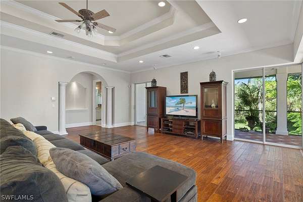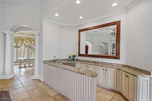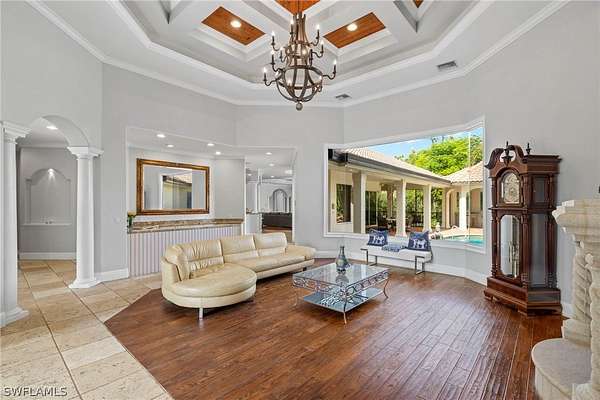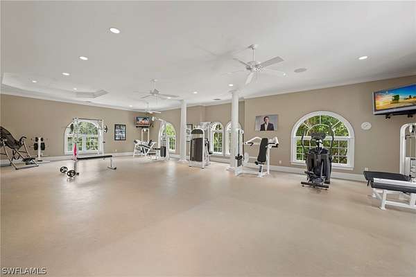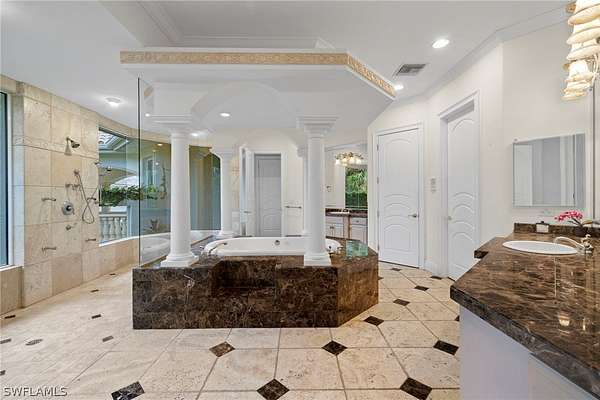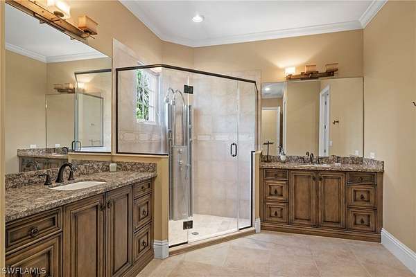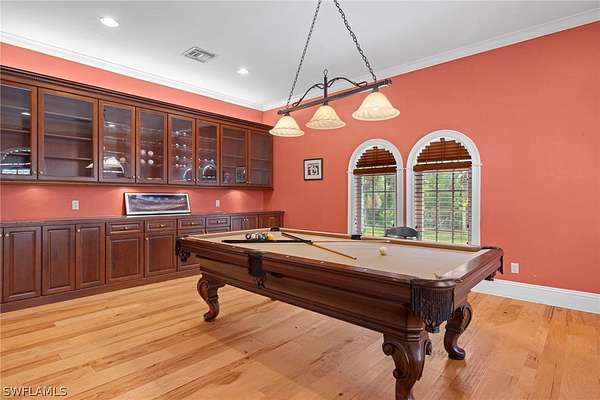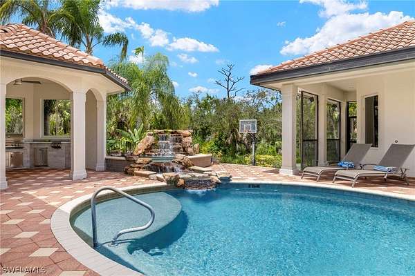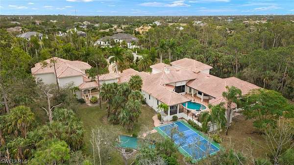 Coveted privacy and unparalleled enjoyment perfectly merge in this stunning estate. When World Series-winning Boston Red Sox pitcher Derek Lowe moved his family to Southwest Florida, they designed the perfect family compound conceived with the concept that life is short, so enjoy every minute. What resulted was this amazing 11,000-square-foot estate with everything one could imagine. From the huge in-home theater with leather stadium-style seating to the billiard room connected with a sports-watching lounge. The home blends indoor and outdoor living wrapped around an elevated pool with a fountain and waterfall and an outdoor kitchen nestled under a beautiful covered cabana. Beyond the pool is a private basketball court, a pickleball court, and a four-hole putting green. No need for a spa visit because the huge primary bath features a soaking tub, a large shower, stunning finishes, and a massage room. Not to be overlooked the home also features a yoga/ballet studio, crafting room, and cigar room designed for a walk-in humidor. A beautiful walkway takes you to the guest house where you'll find a full gym, sauna, and locker room. The community includes a boat storage and launch area. This home has it all!