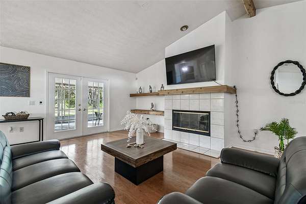 The open great room with fireplace, dining area, and breakfast nook create a spacious, inviting interior. French doors from the primary suite lead to a screened, covered patio overlooking the serene pond. Additional features include hardwood floors, ample closet space, indoor laundry, and a circular driveway. The home is topped with a 2016 metal roof, paired with a 2016 Goodman 3.5-ton AC, a septic system updated in 2019, two water heaters, propane tanks, irrigation, water distiller, and a security system (owned).