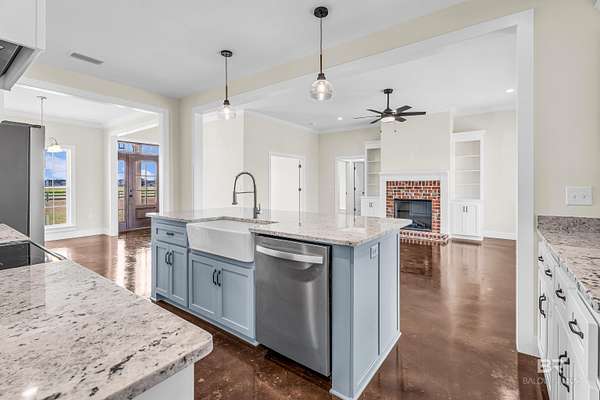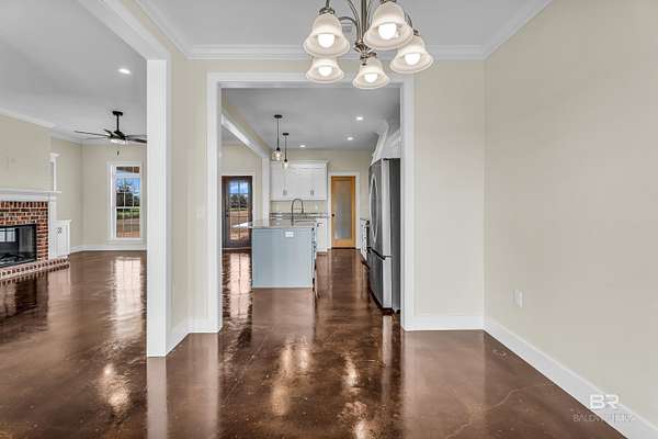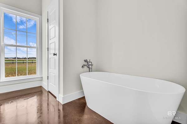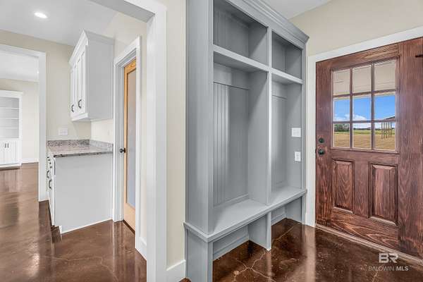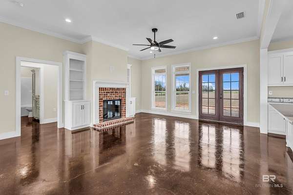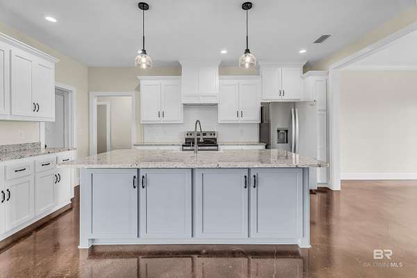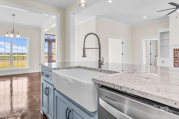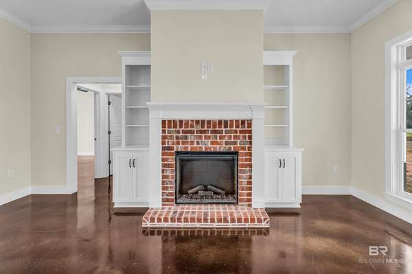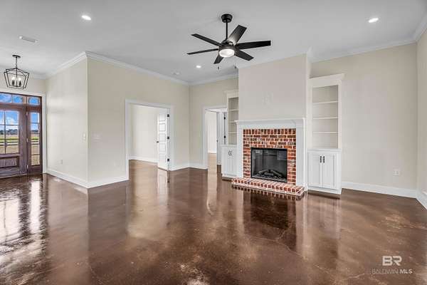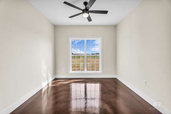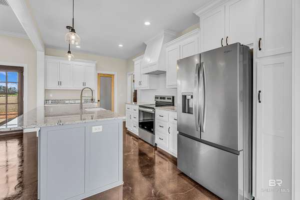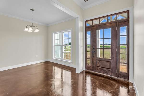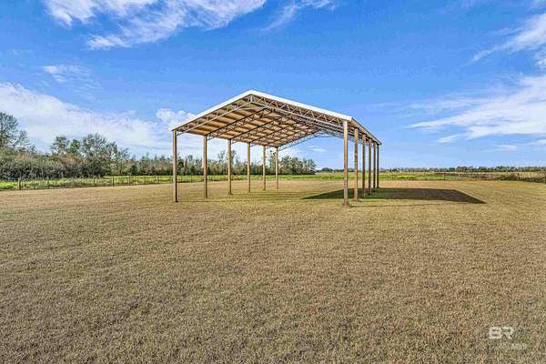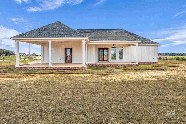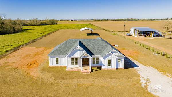 Stunning new construction custom home on 5.2 acres! This thoughtfully designed 3-bedroom, 2.5-bath home with a dedicated office offers a comfortable and functional layout ideal for everyday living. The kitchen and baths feature beautiful painted cabinetry paired with granite countertops, while crown molding and an electric fireplace enhance the main living spaces. A built-in drop zone adds everyday convenience, and the covered porch is ideal for relaxing. Large windows invite natural light and showcase the serene surroundings, creating a seamless connection between indoor living and the peaceful outdoor setting. The primary suite offers a comfortable retreat with dual vanities, a walk-in closet, tile shower, and a freestanding soaking tub. A separate dining room provides an ideal space for entertaining and gatherings. The property also includes a 30x50 pole barn, offering ample space for storage, hobbies, or equipment. Enjoy the freedom of NO HOA, all while being located in an area with a country feel yet close to everything. This home is less than 3.5 miles to the hospital, minutes to shopping and dining, and just 16 miles to the Gulf Coast's white-sand beaches. A rare opportunity to enjoy space, comfort, and convenience in a custom new home! Buyer to verify all information during due diligence.