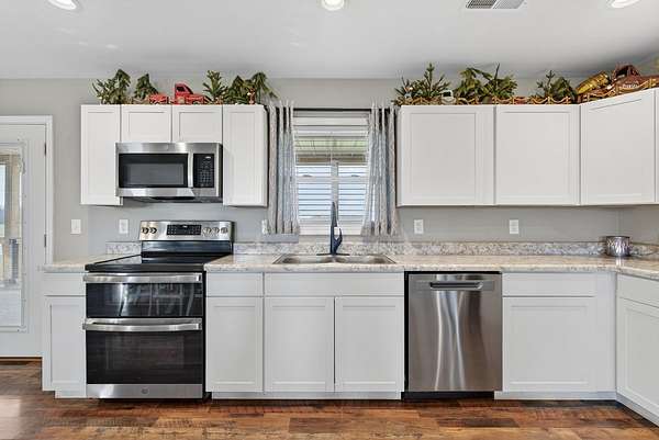 - Dishwasher, Double Oven, Electric Oven, Electric Range, Microwave, Refrigerator, Stainless Steel Appliance(s)