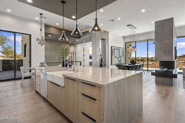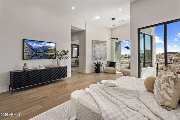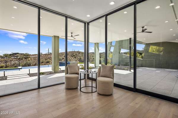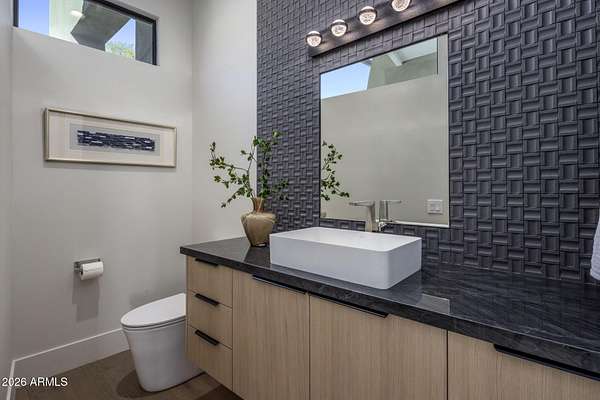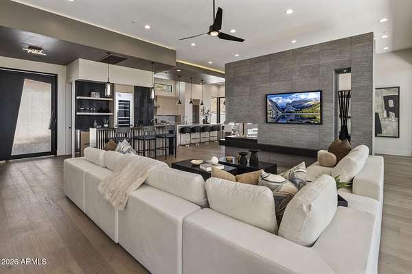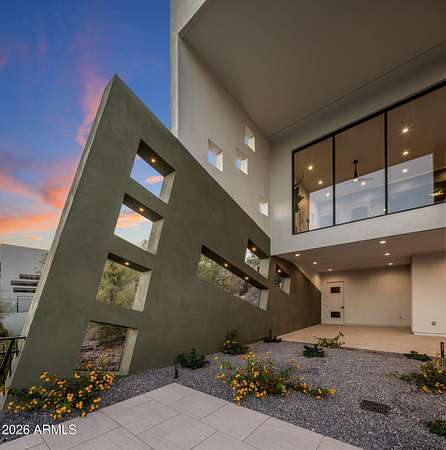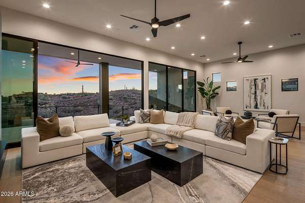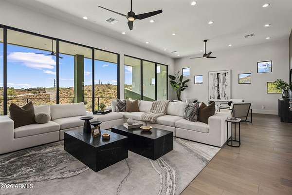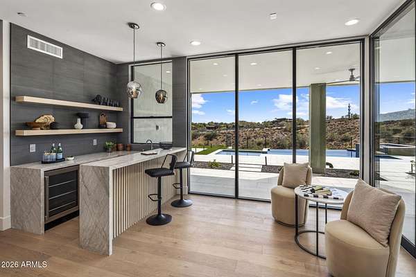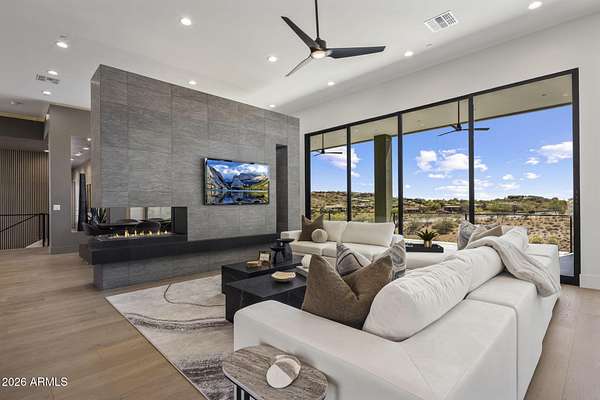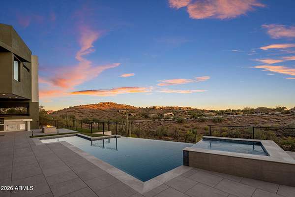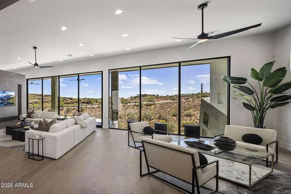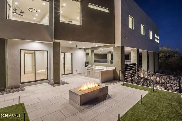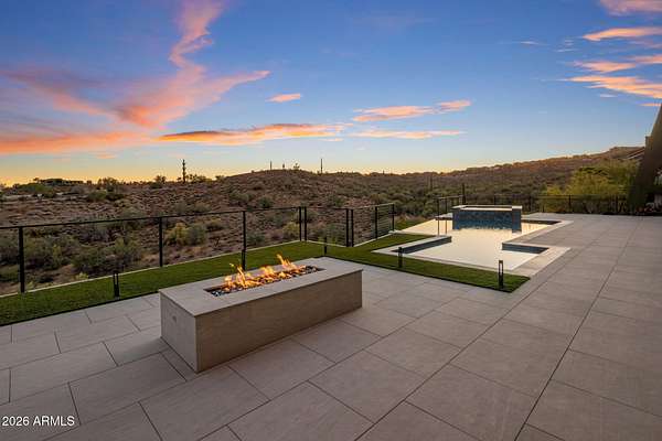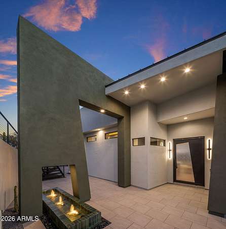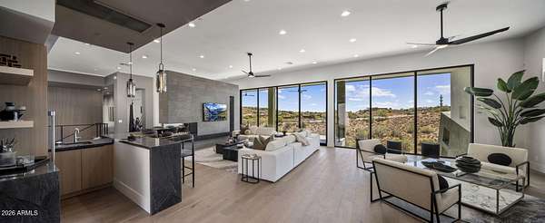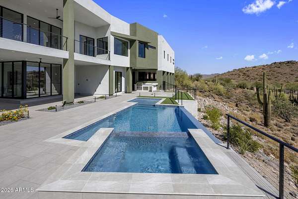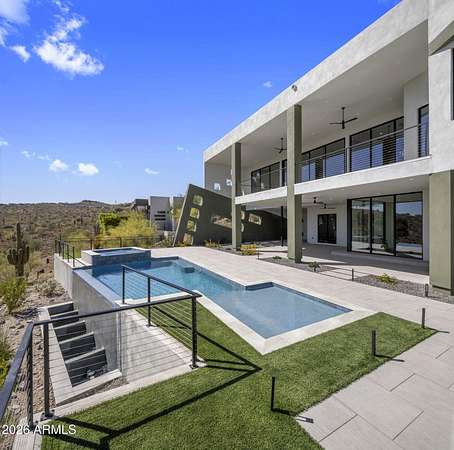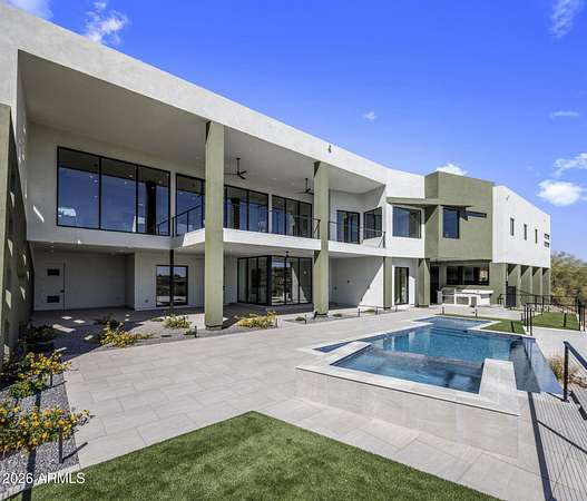 Introducing a 2026 masterpiece by Picasso Homes, nestled within the exclusive gated enclave of Palatial Estates in Fountain Hills. This striking modern-contemporary residence seamlessly blends architectural sophistication with elevated everyday living. Spanning two thoughtfully designed levels. The primary suite is privately situated on the main level, creating a true retreat complete with a serene sitting area and spa-inspired bath. Designed for both grand entertaining and comfortable living, the main floor features a formal dining room, a dedicated office, and an expansive open-concept kitchen outfitted with premium finishes and seamless flow into the living spaces, powder room, spacious laundry and key drop. Downstairs: 3 spacious bedrooms, each w/its own ensuite bath along with an an additional powder, a theatre room and versatile flex space with a built-in bar, refrigerator, and sink provide the perfect setting for hosting or relaxing. Be captivated by the sunsets from the walk out patio. Step outside to your own resort-style backyard, where a sparkling pool and spa, built-in BBQ, and multiple lounging areas invite year-round enjoyment under Arizona skies--all framed by stunning views. A 4-car garage completes the home, offering ample space for collectors and convenience alike. Rare opportunity to own a brand-new, design-forward luxury residence in one of the area's most known gated communities.