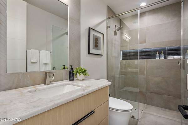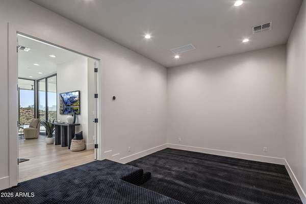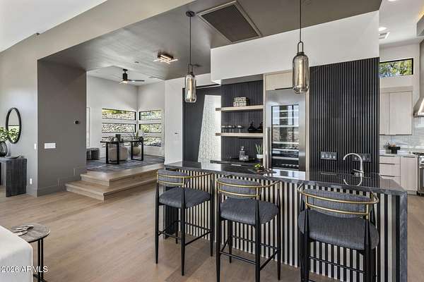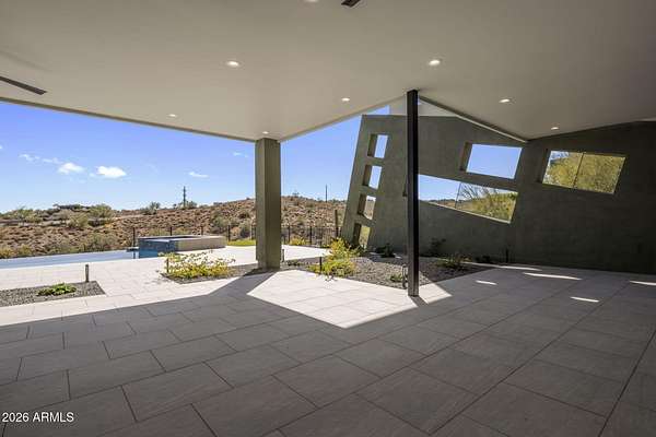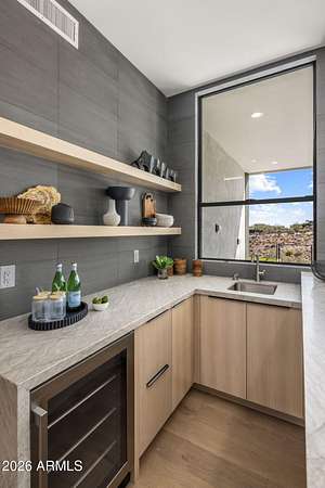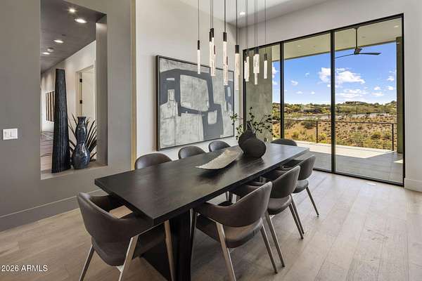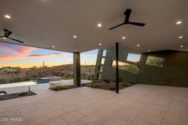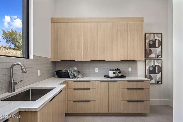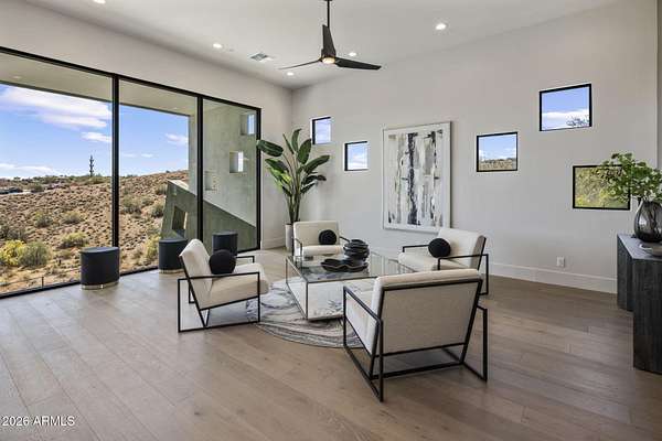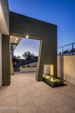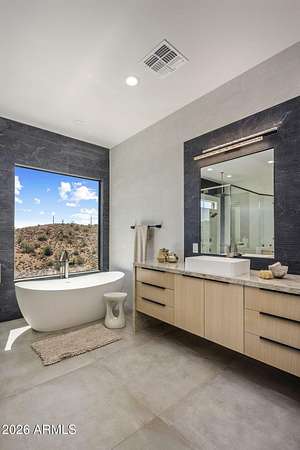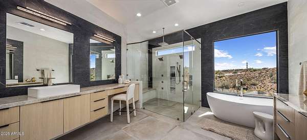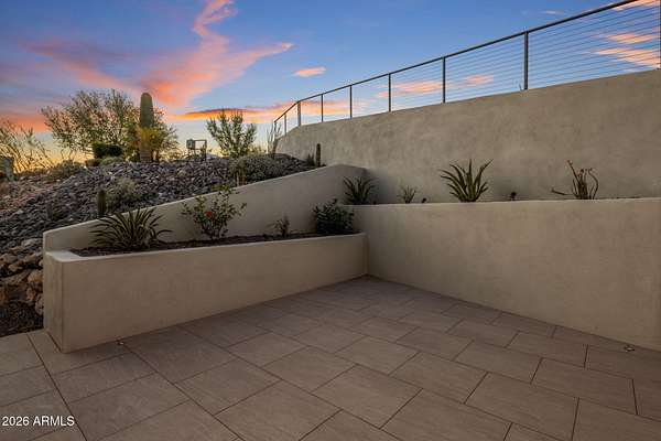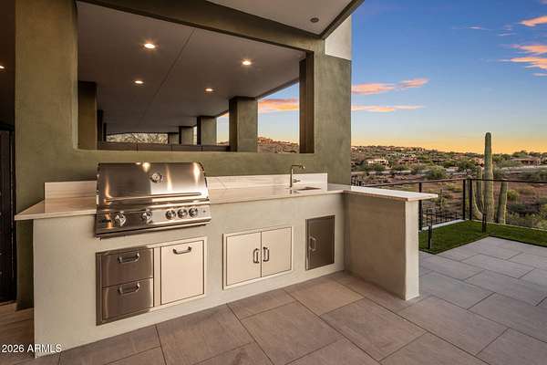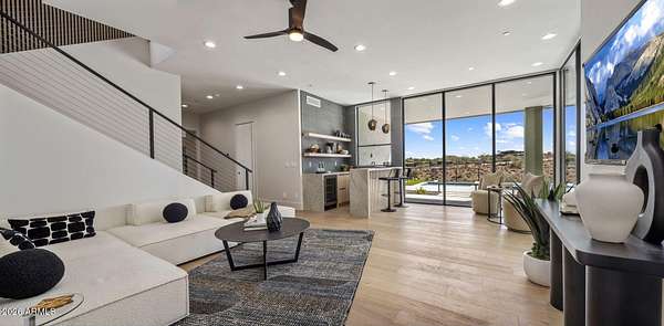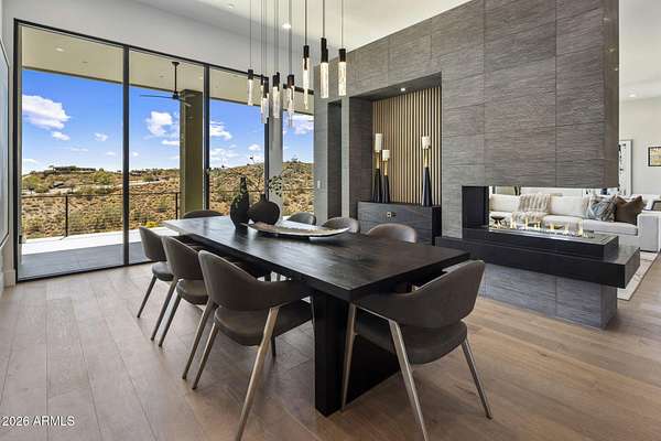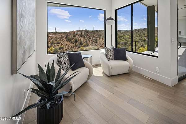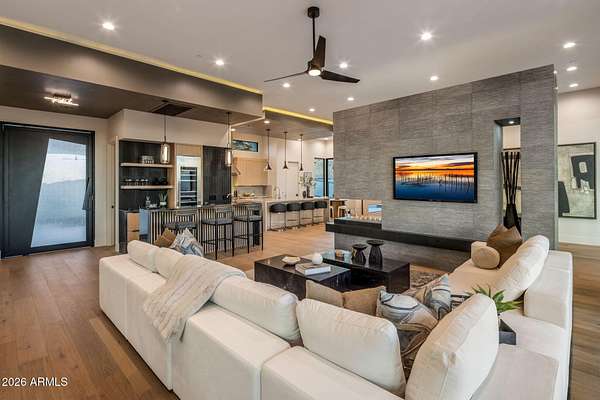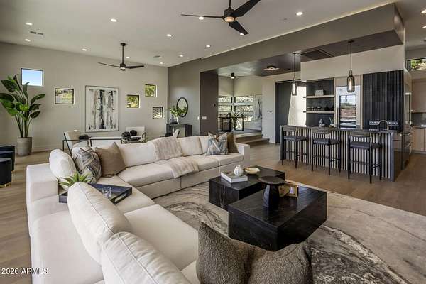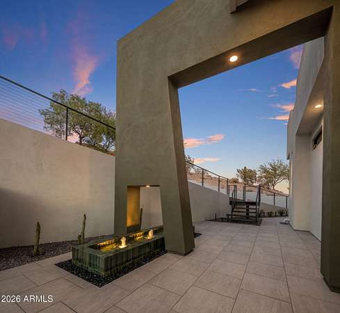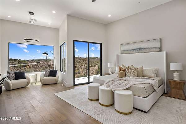 Introducing a 2026 masterpiece by Picasso Homes, nestled within the exclusive gated enclave of Palatial Estates in Fountain Hills. This striking modern-contemporary residence seamlessly blends architectural sophistication with elevated everyday living. Spanning two thoughtfully designed levels. The primary suite is privately situated on the main level, creating a true retreat complete with a serene sitting area and spa-inspired bath. Designed for both grand entertaining and comfortable living, the main floor features a formal dining room, a dedicated office, and an expansive open-concept kitchen outfitted with premium finishes and seamless flow into the living spaces, powder room, spacious laundry and key drop. Downstairs: 3 spacious bedrooms, each w/its own ensuite bath along with an an additional powder, a theatre room and versatile flex space with a built-in bar, refrigerator, and sink provide the perfect setting for hosting or relaxing. Be captivated by the sunsets from the walk out patio. Step outside to your own resort-style backyard, where a sparkling pool and spa, built-in BBQ, and multiple lounging areas invite year-round enjoyment under Arizona skies--all framed by stunning views. A 4-car garage completes the home, offering ample space for collectors and convenience alike. Rare opportunity to own a brand-new, design-forward luxury residence in one of the area's most known gated communities.