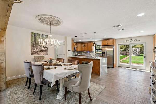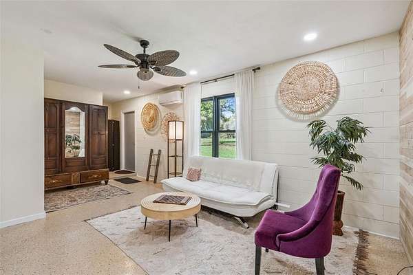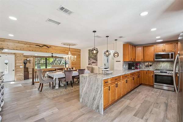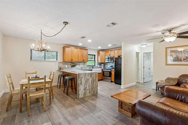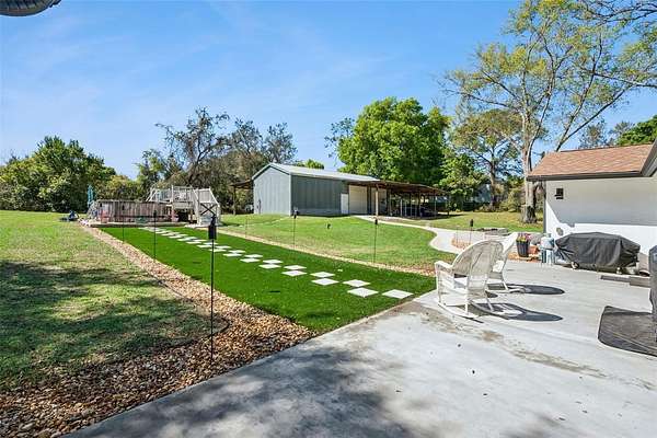 Welcome to this stunning, fully renovated modern farmhouse nestled within the peaceful Vinola Gardens neighborhood in the highly sought-after Montverde area, offering old Florida, small town living. Set on 4.41 acres with NO HOA, this exceptional property provides privacy, modern upgrades, and powerful income-producing potential. The main residence features extensive renovations including new stucco, full interior/exterior paint, premium Andersen windows and patio doors, porcelain flooring throughout, updated plumbing and electrical, a new breaker box, new AC/furnace with UV purification, skylights, upgraded lighting, and remodeled bathrooms. Two brand-new kitchens showcase granite waterfall countertops, custom cabinetry, and designer finishes. A separate one bedroom and bathroom apartment and an additional studio with bathroom are outstanding rental income options or flexible multigenerational living. The living room wall can easily be opened to re-connect the apartment to the main home, giving buyers the option to expand the primary living space if desired. The apartment features updated finishes and new flooring, while the studio has new flooring along with beautiful cedar accents and dedicated climate control. The property includes a 48Lx21W Steel building with two 10-foot-tall garage doors perfect for storing equipment, recreational vehicles, or outdoor toys. Steel building has three covered sides—ideal for boats, RVs, trucks, trailers, and more. Two additional sheds (10x16 and 12x24) add versatile storage options. The property also offers 10 conveniently placed outdoor water spigots around the pole barn, both sheds, and the front of the home. Land renovations include an extended driveway, covered porches, new sidewalks, pergolas, painted sheds, new front fence and gate, a full landscape overhaul, new sod, a sprinkler system with controls, French drains, water run-off enhancements, a new drain field, new water heater, and a new water tank. Bring your Barn plans, horses, farm animals to this remarkable acreage offers endless possibilities. Additional custom features include cedar accents, a custom bookshelf, a TV enclosure, a remodeled laundry room + extra storage, and a fully finished 4th bedroom suite with private bath. Located just minutes from shopping, hospitals, and the world-renowned Montverde Academy, this property delivers acreage, luxury, flexibility, and unmatched income potential, tucked away in your own private nature preserve with a beautiful oak grove to take your morning strolls through. Don't miss out on this one-of-a-kind opportunity that offers big city access while living tucked away in beautiful country charm.