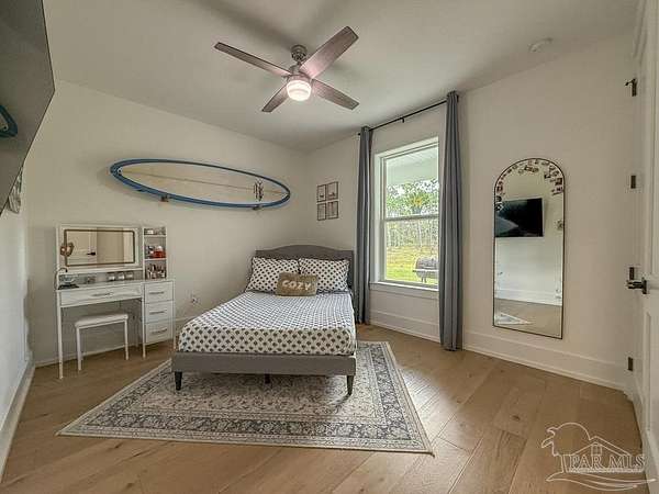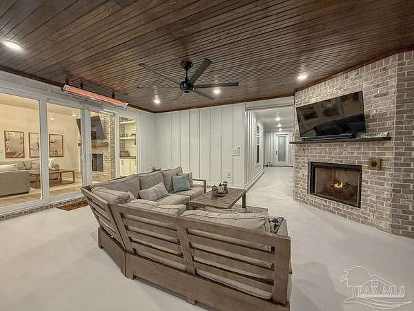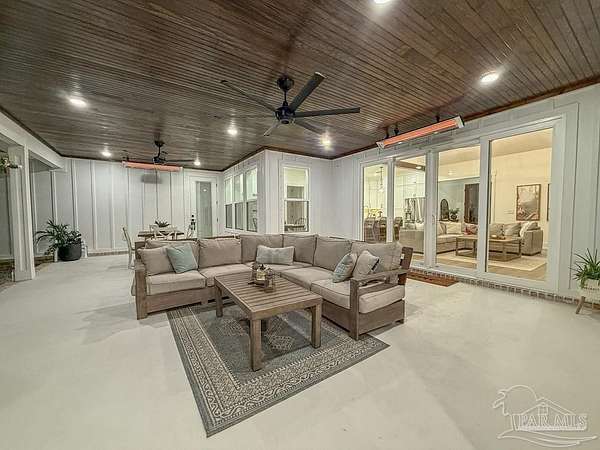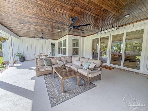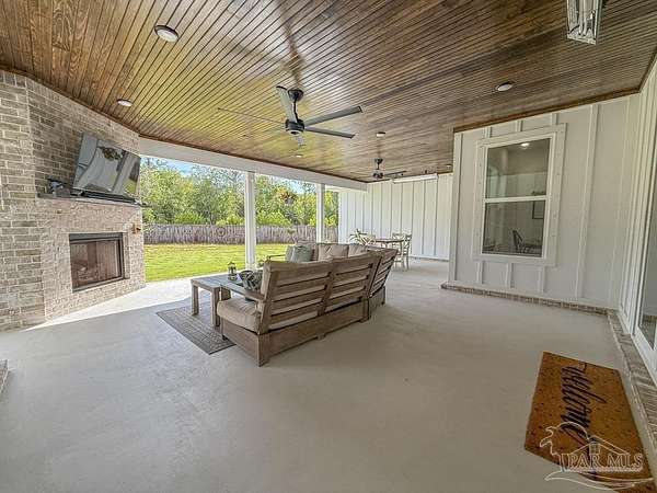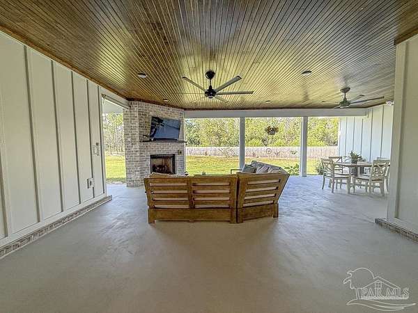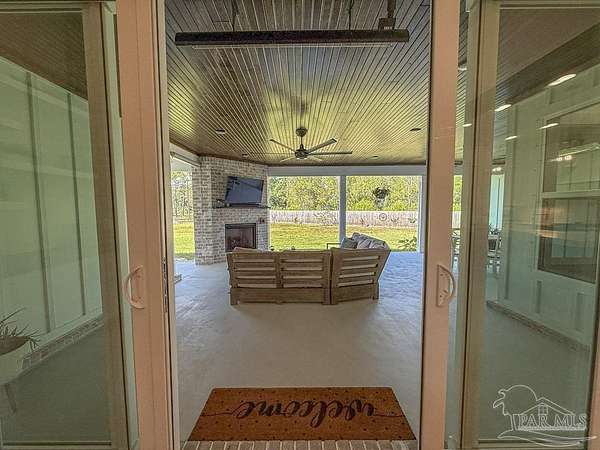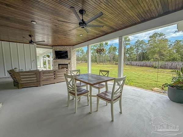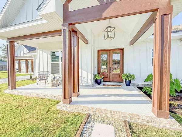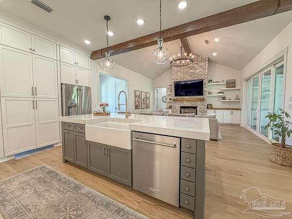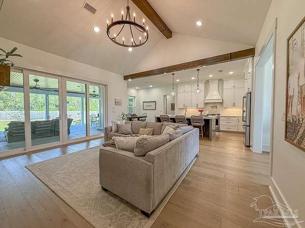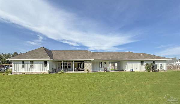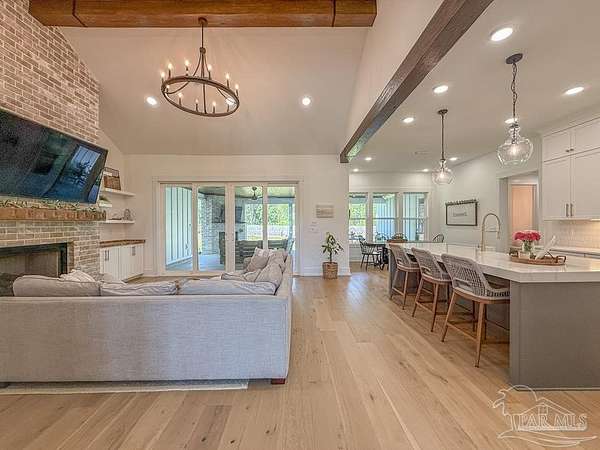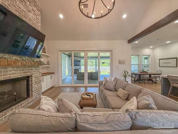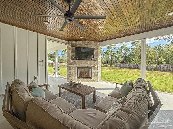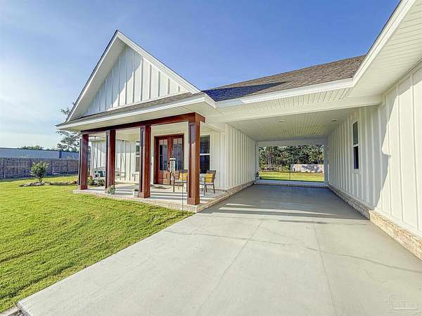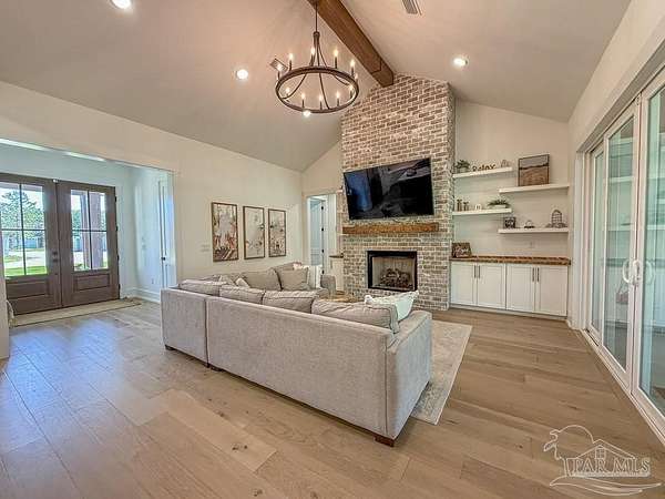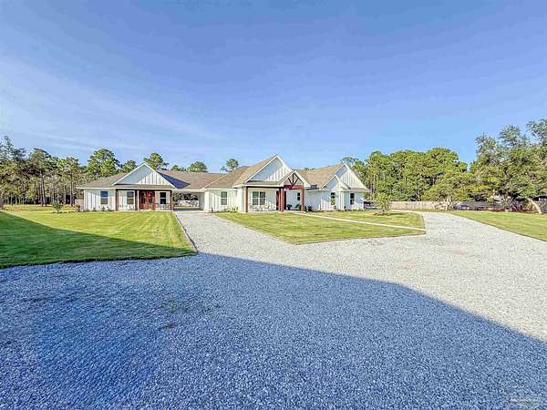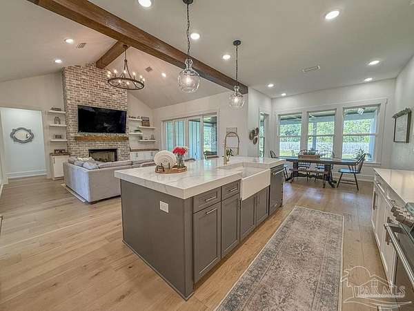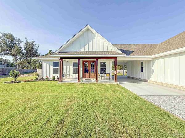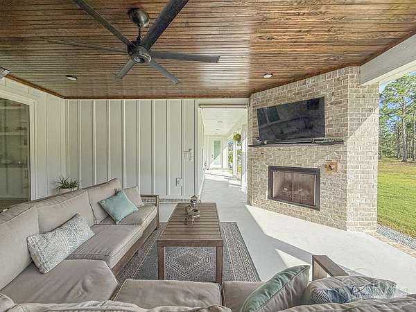 Luxury Modern Farmhouse Minutes from the Beach - 2+ Acres! Step inside this custom-built modern farmhouse and experience the perfect blend of craftsmanship and comfort. The open-concept design showcases vaulted ceilings with distressed wood beams, a floor-to-ceiling brick gas fireplace, custom built-ins, and engineered hardwood floors throughout. Double hurricane-impact doors fill the space with natural light and create a seamless connection to the outdoors. The chef's kitchen is the heart of the home, featuring quartz countertops, gas range with pot filler, farmhouse sink, oversized island, and a hidden butler's pantry with plenty of storage for appliances. A bright dining area offers peaceful backyard views, ideal for family meals or entertaining. The primary suite is a private retreat with patio access, tray ceiling, and a spa-inspired bath that includes a freestanding tub, oversized glass shower, dual vanities, water closet, and a massive walk-in closet with direct laundry access. Three additional bedrooms share a designer bath with double vanities, tiled shower, and linen storage. Connected by a breezeway, the private in-law suite adds flexibility with its own entrance, full kitchen, laundry, vaulted ceilings, HVAC system, and carport - perfect for guests, extended family, or rental income. Step outside to enjoy the exceptional outdoor living space. The covered patio features a wood-plank ceiling, recessed lighting, dual HVLS fans, infrared heaters, a second gas fireplace, and pre-plumbed for an outdoor kitchen - this space is built for year-round gatherings. The expansive 2+ acre property offers incredible flexibility with plenty of room for a future guest house, workshop, or additional structures (buyer to verify). Bring your boat, RV, and all your toys - ample parking, epoxy garage floor, attic storage, and no HOA restrictions. Homes with this much land, flexibility, and proximity to the beach are hard to find - schedule your showing today!