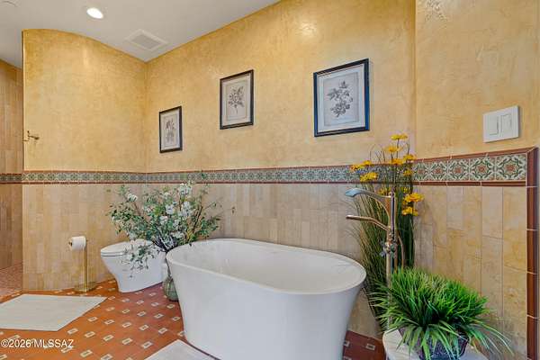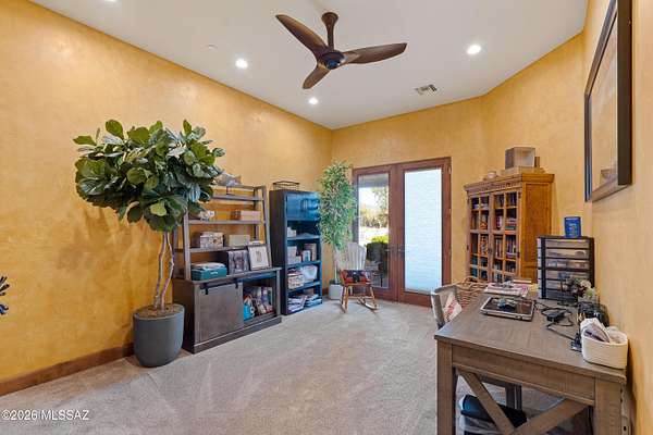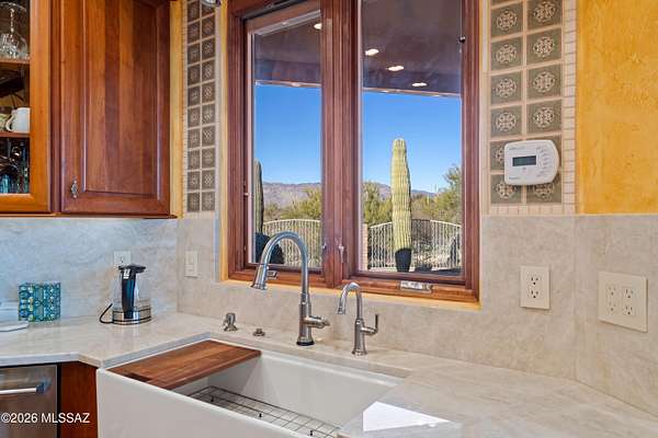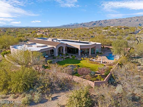 Exquisite custom home on just over 2 acres that recently underwent a stunning $250,000 renovation. This magnificent estate spans 5,144 square feet is a masterpiece of luxury, boasting a gourmet kitchen, a private casita, expansive office, a dedicated yoga/exercise studio and an impressive wine cellar with oak barrel flooring and new cooling unit. Outdoor living is equally refined with a pool, spa, owned solar panels (installed 2023) and a 3-car garage. Notably, the great room features floor-to-ceiling sliding windows that effortlessly dissolve the boundary between the interior and the beautiful backyard. Step inside and you'll see gorgeous, handmade tiles in every bathroom and tastefully upgraded countertops throughout. The exterior of the home was painted in December 2021, and the residence is connected to a water filtration system installed June 2022. The entire backyard perimeter is snake-proofed, and there is a dog washing station in the garage to keep furry friends clean! This absolutely fabulous custom home is one-of-a kind, complete with views that stretch for miles and enjoyed from every window.