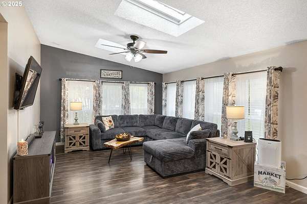 - Ceiling Fan, Laminate Flooring, Laundry, Quartz, Skylight, Vaulted Ceiling, Wallto Wall Carpet, Washer Dryer