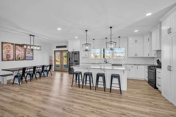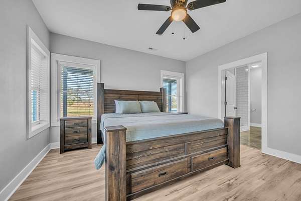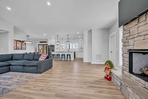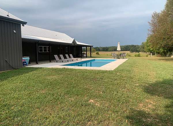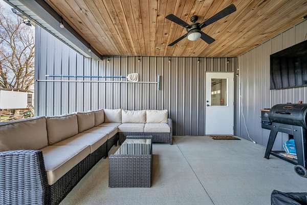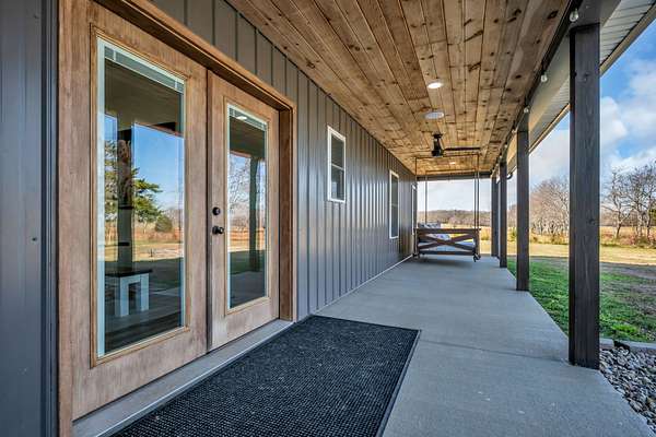 Luxury meets functionality on 5 acres in this exceptional 3 Bedroom barndominium-style home featuring metal siding with rock accents and covered front and rear porches. Open-concept living showcases a gas rock fireplace and custom built-in cabinetry throughout. The custom kitchen offers an oversized bar, Quartzite countertops, soft-close cabinetry, smart appliances, and a hidden walk-in pantry.