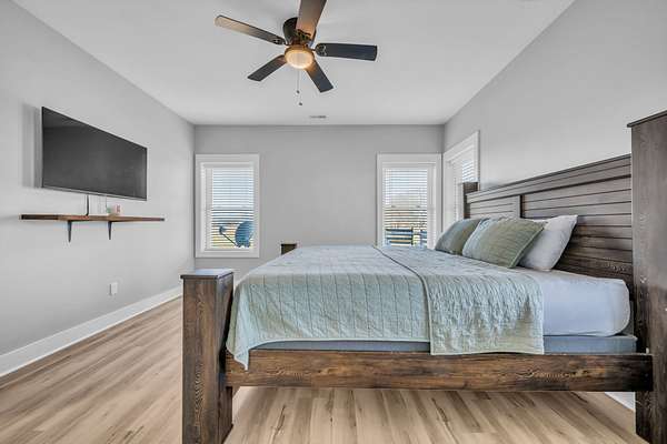 The primary suite is a private retreat with a custom walk-in closet and spa-like bath featuring cultured marble finishes, double vanities, and a tiled walk-in shower with dual shower heads and a center rain shower. Upgrades include 3' solid wood doors, LVP flooring, TV wall mounts throughout, and energy-efficient double-hung argon gas-filled windows.