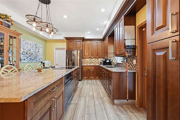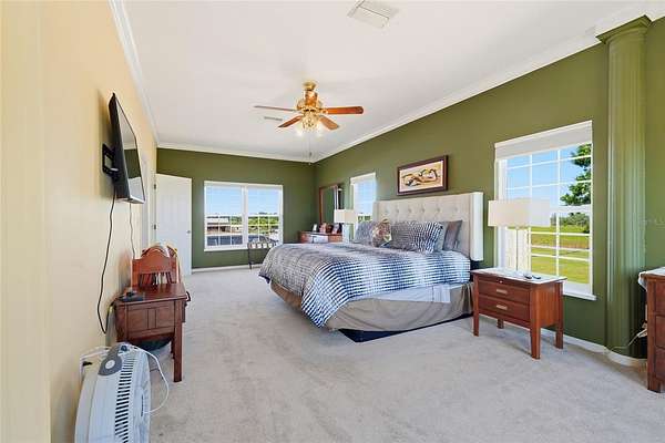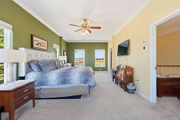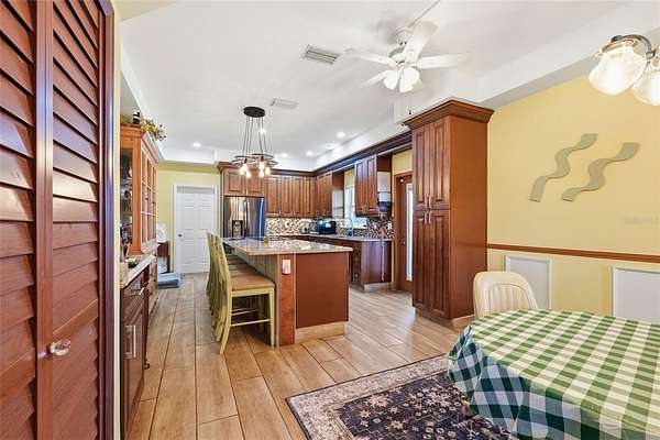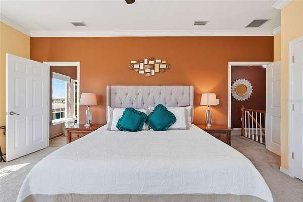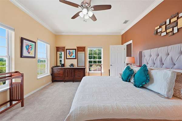 - Accessibility Features, Ceiling Fans(s), Crown Molding, Dry Bar, Eat-In Kitchen, Living Room/Dining Room Combo, Open Floorplan, Primary Bedroom Upstairs, Solid Surface Counters, Solid Wood Cabinets, Split Bedroom, Stone Counters, Thermostat, Walk-In Closet(s)