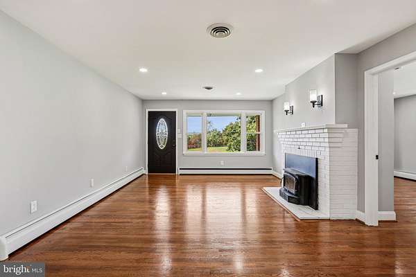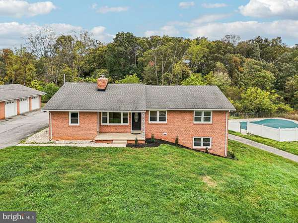 Escape to your own world with this stunning six-bedroom, three-full bath brick rancher nestled on a magnificent 5-acre lot, offering unparalleled amenities including an astro-turf sports field and a fenced-in, in-ground swimming pool. The main level showcases luxury living with refinished hardwood floors, fresh paint, and bright vinyl double-pane windows throughout. Highlights include a cozy living room with a wood-burning fireplace, a formal dining room with deck access, and a sparkling kitchen equipped with new granite countertops, stainless-steel appliances, and updated white cabinetry. The main floor also features a flexible office/den/bedroom with a separate entrance, an updated full hall bath, and a private primary bedroom retreat with an updated en-suite bath. The finished lower level dramatically expands your entertaining options with a spacious rec room featuring a second wood-burning fireplace and new LVP floors, a stylish full bath, and two large additional bedrooms with new carpet. Practicality meets luxury with a large laundry / storage room and a large circular driveway leading to a detached, expanded three-car garage. From the charming covered front porch to the convenient closed-in rear porch and deck, this property delivers unmatched space and amenities for upscale living and entertaining
