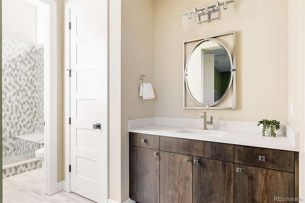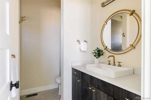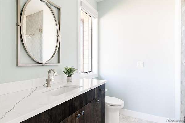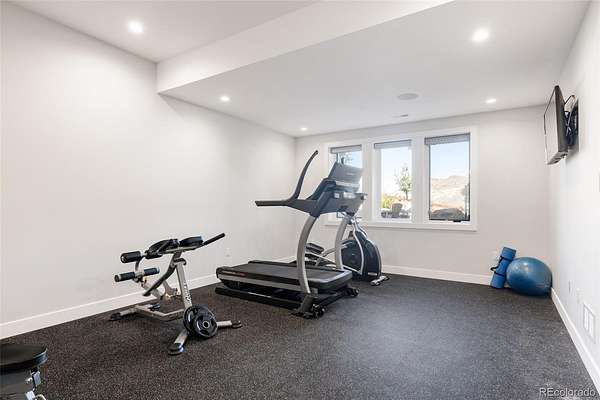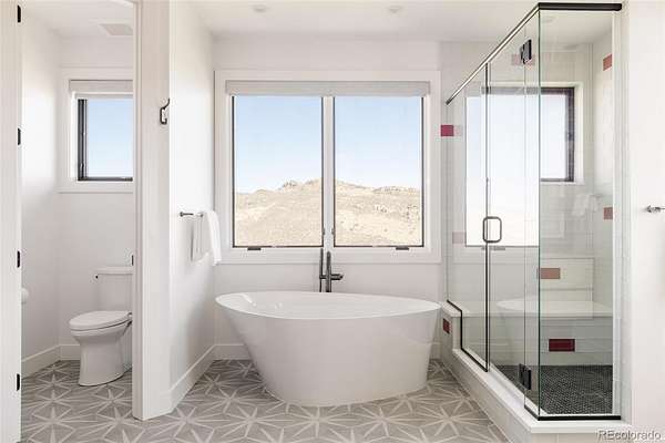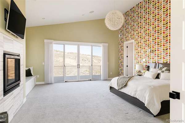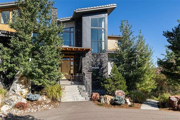 The primary suite is its own retreat: a spa-caliber bath, walk-in closets, and a private deck facing the ridge. Below, a fully finished lower level offers a media room, fitness space, guest accommodations, and direct access to the outdoor living areas — a fire pit terrace, massive water feature and multiple covered spaces that make the Colorado seasons genuinely livable.