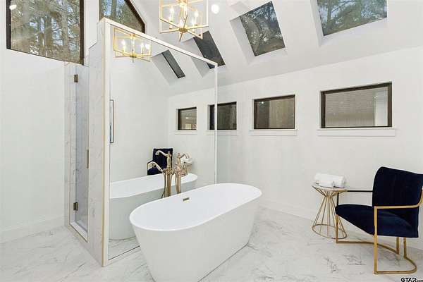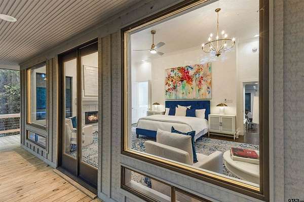 Spanning almost 7 acres, this gated property offers expansive water vistas conveniently located minutes from Tyler's growing southern corridor and only 90 miles east of Dallas. Featuring timeless design this estate has been transformed with an infusion of bespoke finishes and quiet luxury connecting it to the natural light and views beyond. Surrounded by a multitude of hardwoods and pines, the extraordinary property has been thoughtfully enhanced to encourage the new owner to entertain and create endless memories in this legacy estate. With the primary bedroom suite downstairs, an additional bedroom downstairs and 3 more bedrooms with 2 full bathrooms upstairs: there is plenty of space to host. Large living room open to the gourmet kitchen has walls of windows with clear views to the water. Make this your next home and start making memories to last a lifetime!