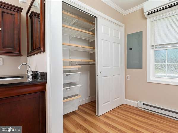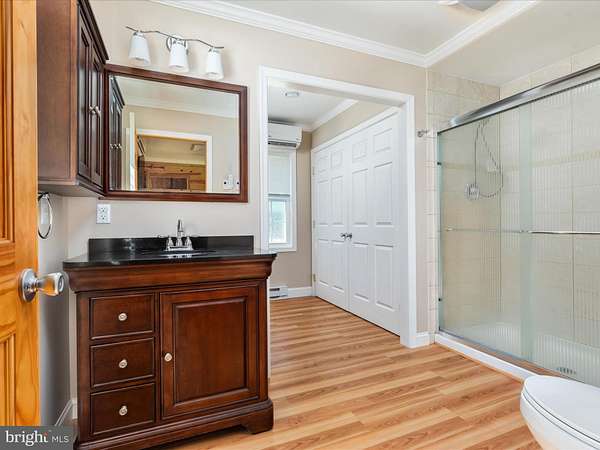 - Carpet, Ceiling Fan(s), Crown Moldings, Entry Level Bedroom, Walk-In Shower Bathroom